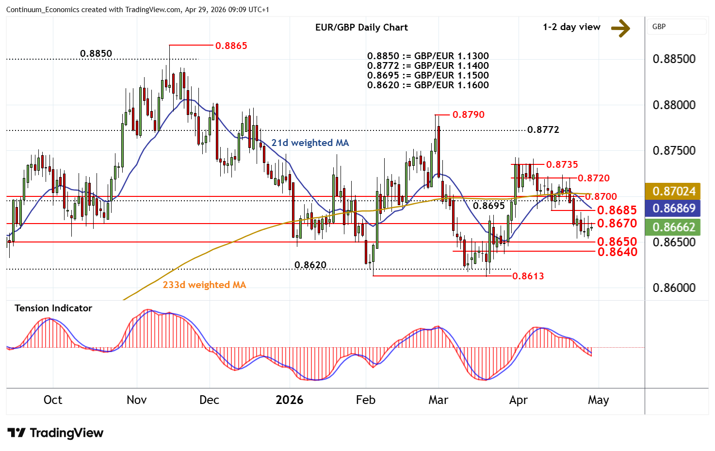 08:55 BST - Still little change, as mixed intraday studies and flat oversold daily stochastics keep near-term sentiment cautious and prompt consolidation above 0.8660. The daily Tension Indicator is falling and broader weekly charts are coming under pressure, highlighting room for fresh losses in the coming session. Support is at congestion around 0.8650 and extends to intraday lows around 0.8640. Initial tests of here should give way to consolidation. A break, however, will add weight to sentiment and open up critical support within 0.8613/20. Meanwhile, a close above congestion resistance at 0.8670 should give way to consolidation beneath the 0.8685 weekly low of 14 April.