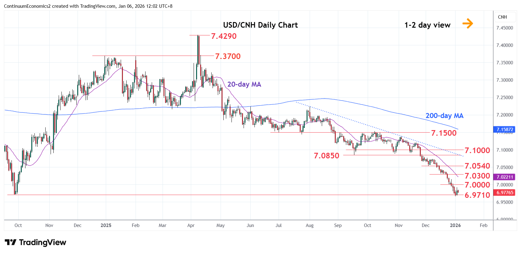 04:05 GMT - Edged up in consolidation from the 6.9663 low as prices unwind oversold intraday studies. Both the daily and weekly studies are stretched as well and caution corrective bounce. However, the downside remains vulnerable and lower will further extend losses from the April 2025 year high and see room to support at the 6.9645/6.9500 area. Meanwhile, resistance at the 7.0000 figure is expected to cap bounce attempt. Regaining this will fade the downside pressure and open up room for stronger gains to retrace losses from the October swing high.