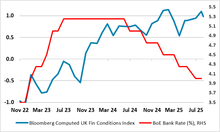 Indeed, term premia in sovereign bond markets have increased in many advanced economies, driven in part by expectations of higher debt issuance, this being something we regard as partly responsible for the tightening in financial conditions that has occurred in the UK and through W Europe despite a narrowing in spreads and what are very elevated equity prices. Indeed, any gauge of financial conditions such as that compiled by Bloomberg suggests that not only have financial conditions failed to fall since the onset of BoE conventional easing over year ago, but that they have instead risen (Figure 1). To us, this tightening in financial conditions is the prime reason for out below-consensus real economy and inflation outlook and why we cling to a view of further BoE easing to the tune of some 75 bp by mid-2026.