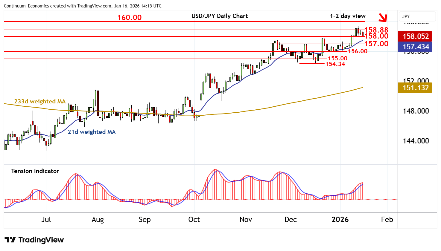 13:55 GMT - Anticipated minor tests higher have not been seen, as prices turn lower in both USD- and JPY-driven trade to pressure support at 158.00. Overbought daily stochastics are unwinding and the positive daily Tension Indicator is flattening, suggesting room for further losses in the coming sessions. A break below 158.00 will open up congestion support at 157.00. Beneath here is further congestion around 156.00, but mixed weekly charts could limit any initial tests in consolidation. Meanwhile, resistance remains at the 158.88 year high of 10 January 2025. However, a close above the 159.45 current year high of 14 January is needed to improve price action and extend September 2024 gains towards 160.00.