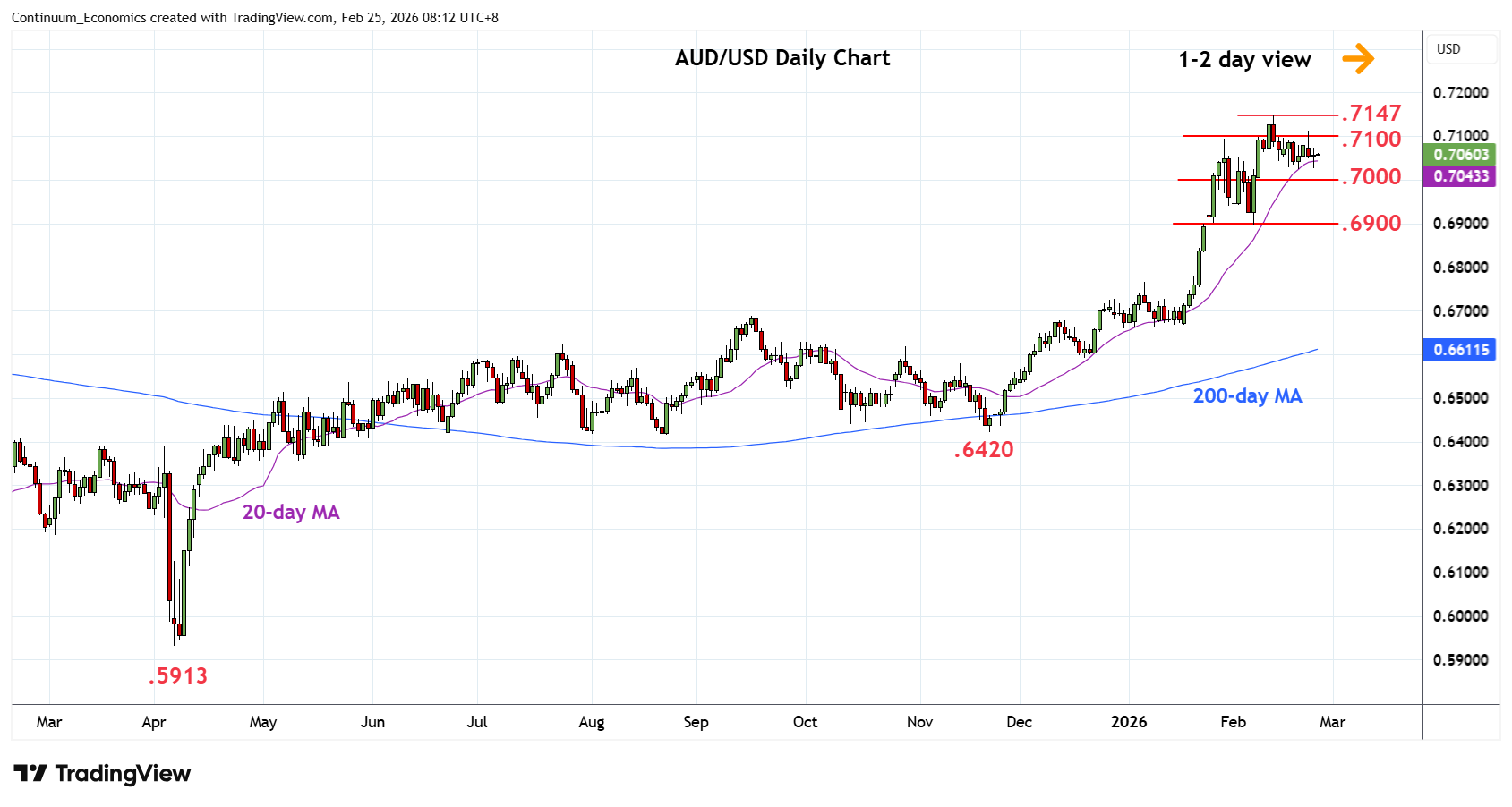 00:15 GMT - Little change, as prices extend consolidation below the .7100. While the latter caps scope is seen for pullback to retest the .7015 low of last week and the .7000 congestion. Would take break here to see room for deeper pullback to retrace the November/February rally to strong support at the .6900 level and .6870, 38.2% Fibonacci level. Meanwhile, resistance remains at the .7100 level and this should keep gains in check. Would need to clear this to expose the .7147 high to retest and see scope to further retrace the 2021/2025 losses.