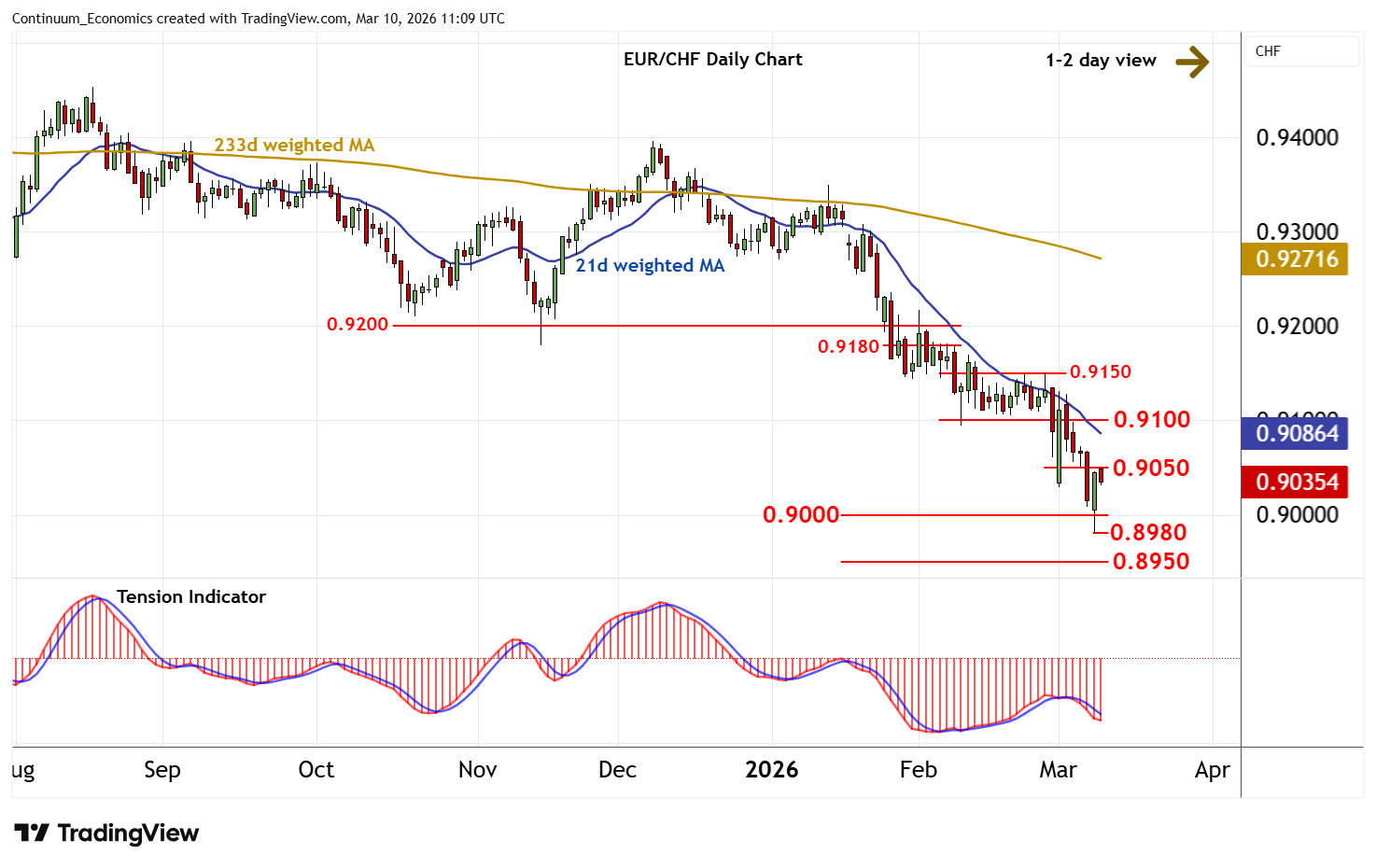 10:55 GMT - Consolidation above critical support at 0.8980/00 has given way to a bounce to 0.9050, where flat overbought intraday studies are prompting short-term reactions. Oversold daily stochastics are unwinding and the bearish daily Tension Indicator is flattening, suggesting room for a test above here. But negative weekly charts and bearish longer-term readings should limit scope in renewed selling interest towards 0.9100. Following cautious/corrective trade, fresh losses are looked for. However, a close below the 0.8980 current year low of 9 March and 0.9000 is needed to turn sentiment negative and extend long-term bear trends initially to 0.8950.