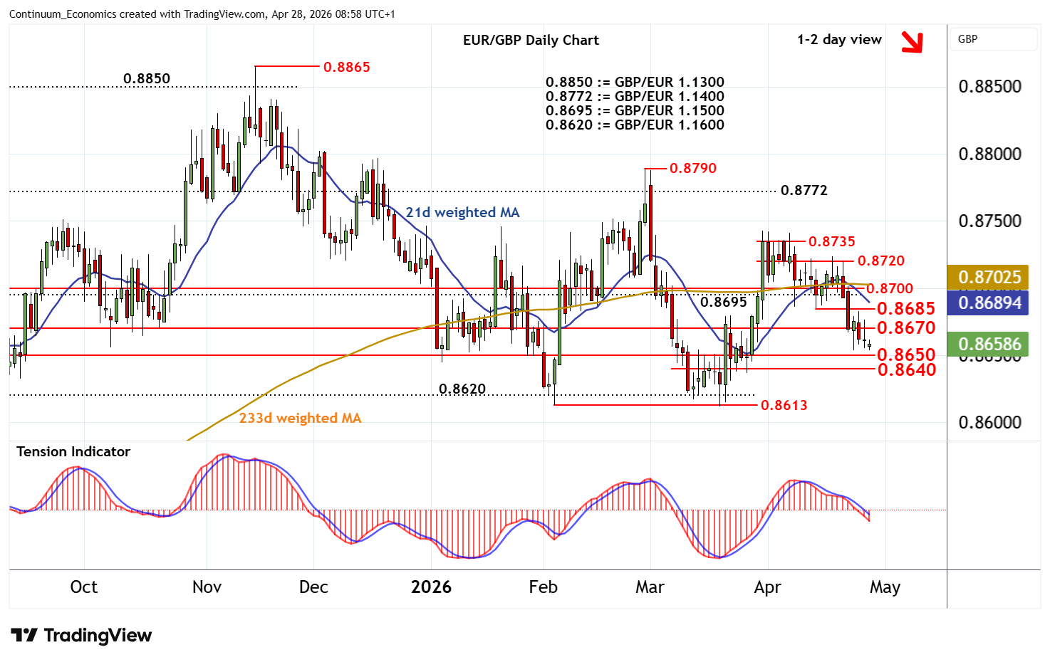 | R2 | 0.8685 | * | 14 Apr (w) low | S3 | 0.8613/20 | ** | 4 Feb (m) low; GBP/EUR 1.1600 | |
