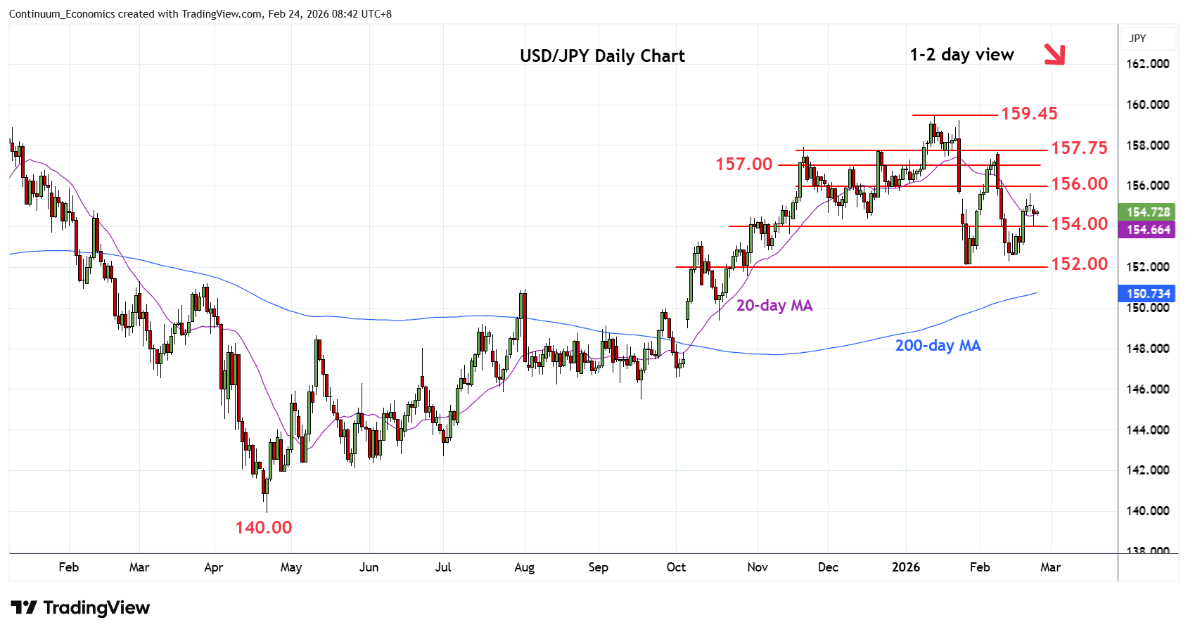 Lower in consolidation from resistance at the 155.50/156.00 area to retest the 154.00 level
