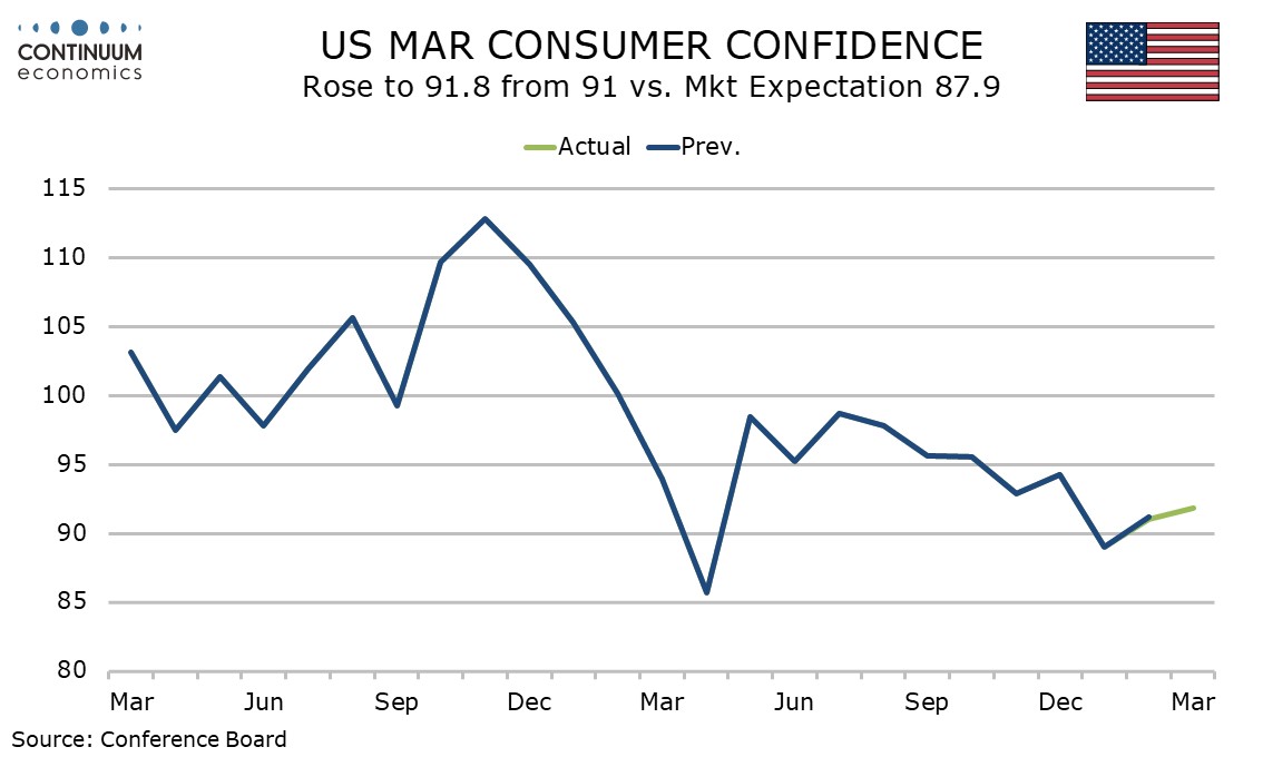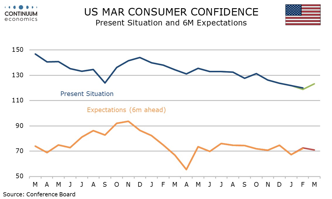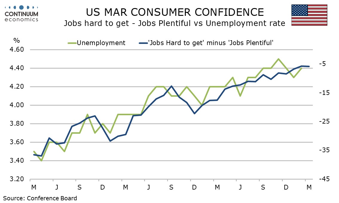 Despite a bounce in inflation expectations, the Conference Board’s consumer confidence index is surprisingly stronger in March at 91.8 from 91.0, a second straight rise though not fully erasing a January dip. February JOLTS data on job openings suggests a fairly stable labor market picture.