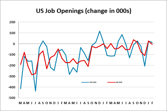 JOLTS data shows a 358k decline in job openings in February but with January revised to a rise of 690k from 396k the net picture is little changed. Three and six month averages are back to near neutral from negatives in December.