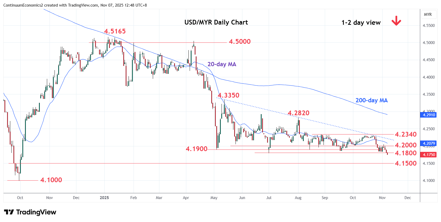 05:00 GMT - Consolidation within the 4.1800/4.2000 area has given way to selling pressure to reach fresh year low at 4.1740. Negative daily and weekly studies keeps pressure on the downside and see room to extend losses from the 4.5165 January high. Lower will see room to the 4.1500 congestion. Below this will turn focus to the 4.1000 September 2024 year low. Meanwhile, resistance is lowered to 4.1800/4.2000 July low and congestion area which is expected to cap and sustain losses from the 4.2300/40 congestion and 27 August high.