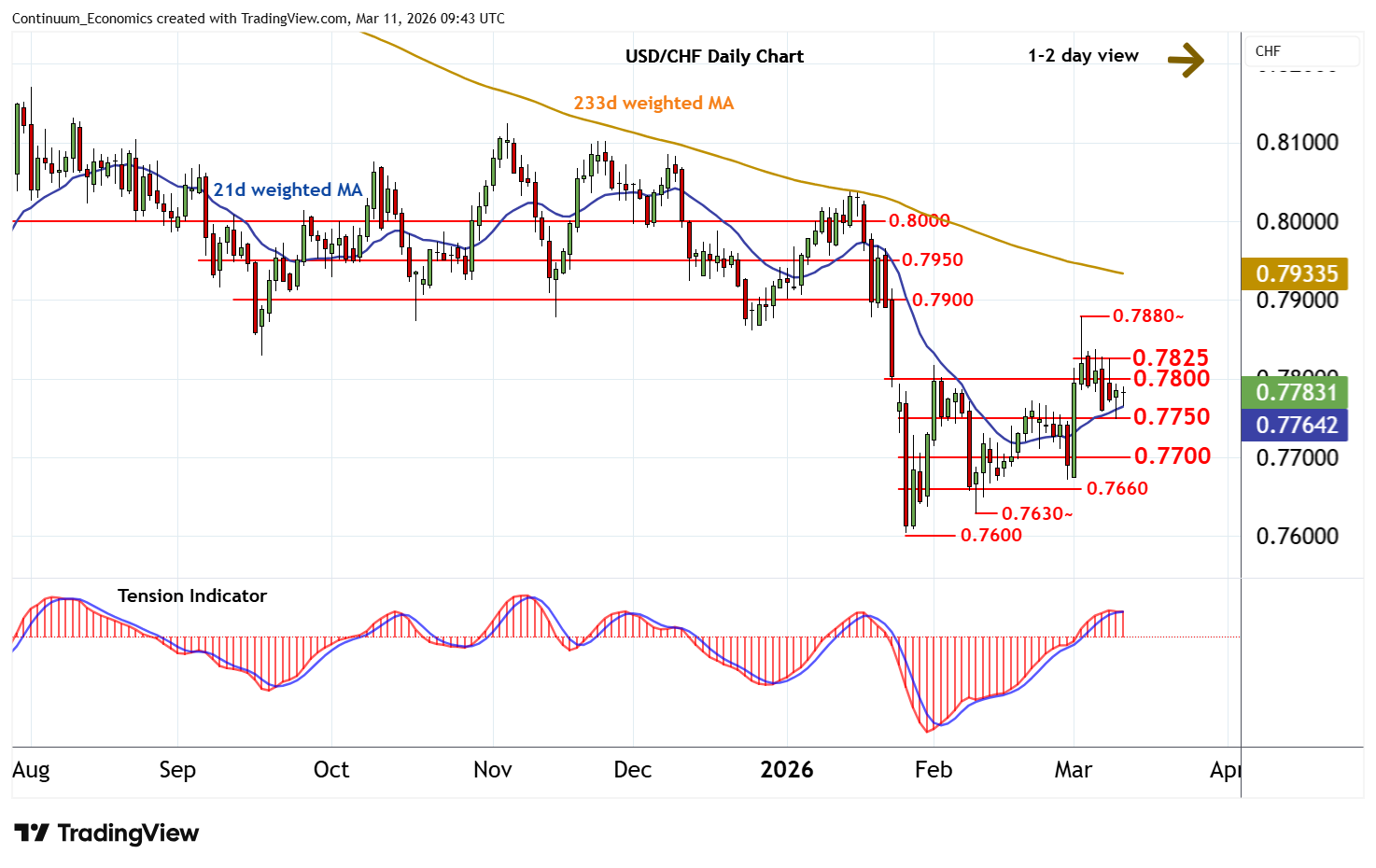 09:30 GMT - Little change, as prices extend cautious trade within the 0.7750 - 0.7800 range. Rising intraday studies highlight room for a test of resistance at the 0.7800 break level. But mixed/negative daily readings should limit any immediate break in consolidation beneath congestion around 0.7825. Broader weekly charts are improving. But a close above the 0.7880/00 range is needed to turn sentiment positive and confirm continuation of late-January gains. Meanwhile, support remains at congestion around 0.7750. A break beneath here, if seen, should be limited in consolidation above 0.7700.