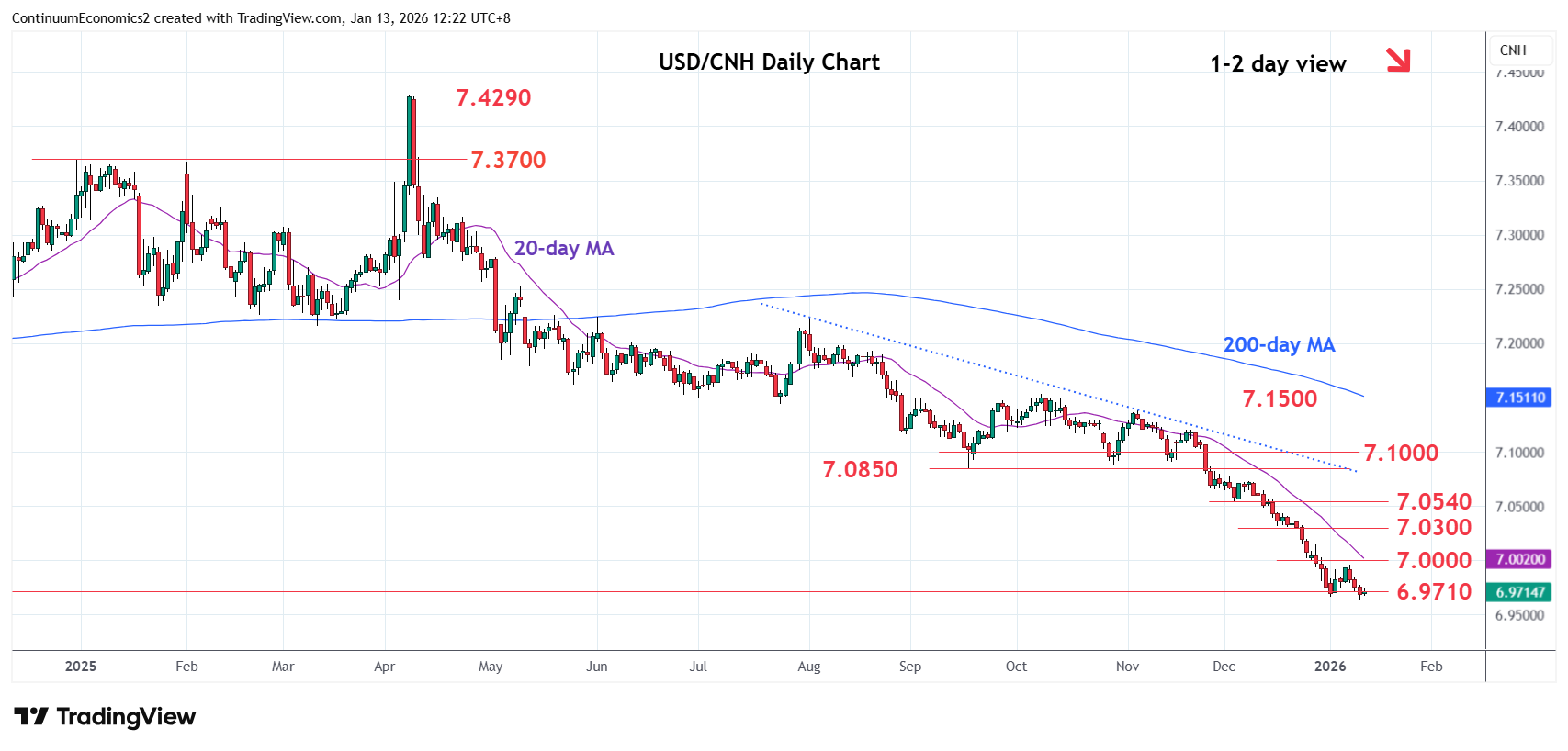 04:35 GMT - Consolidation above 6.9663 low has given way to selling pressure to reach fresh low at 6.9630. Daily and weekly studies remains in oversold area but further losses cannot be ruled out. Lower will further extend losses from the April 2025 year high at 7.4290 and see room for continuation to support at the 6.9500/6.9300 congestion area. Meanwhile, resistance is lowered to the 6.9800 congestion which extend to the 6.9960 high of last week. Would take break of these to ease the downside pressure and see room for corrective bounce to the 7.0300 congestion and strong resistance at 7.0500/40 area.