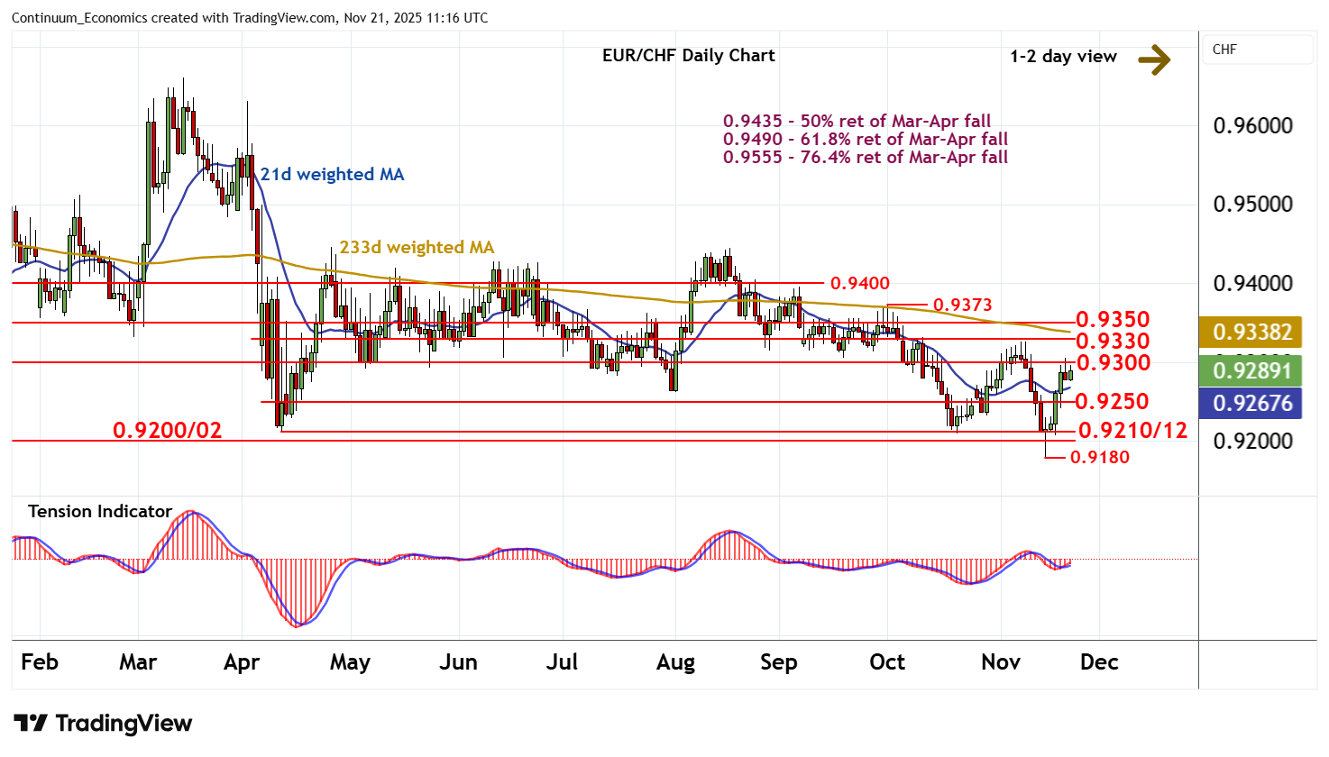 10:55 GMT - Still little change, as deteriorating intraday studies keep prices balanced in choppy trade beneath congestion resistance at 0.9300. A minor pullback is possible, towards support at the 0.9250 break level. But rising daily stochastics and the improving daily Tension Indicator should limit any initial tests in consolidation/buying interest. Meanwhile, mixed weekly charts are expected to limit any immediate break above 0.9300 in renewed selling interest beneath overhead supply within 0.9330/50.