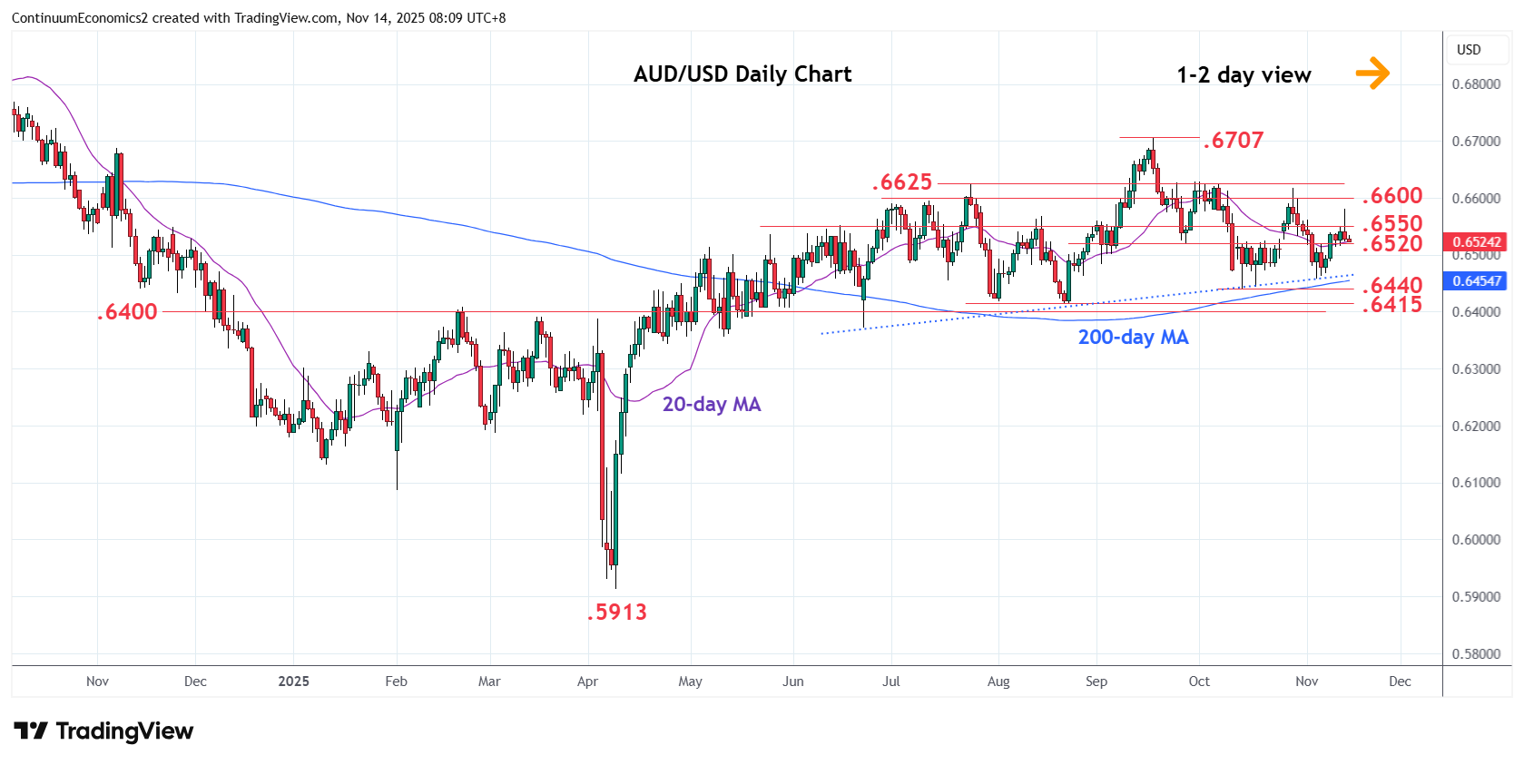 00:10 GMT - Failure to sustain break of the .6550 resistance see prices settling back into range from the .6580 spike high. Lower high from the latter see pressure returning to the .6520/.6500 support and threaten break here to open up room for pullback to retest the .6458 low of last week. Below this will turn focus to the critical .6440 and .6415, October and August lows. Meanwhile, resistance remains at the .6550 congestion. Close above here is needed to clear the way for retest of the .6600 level then the .6625/30, July/October highs.