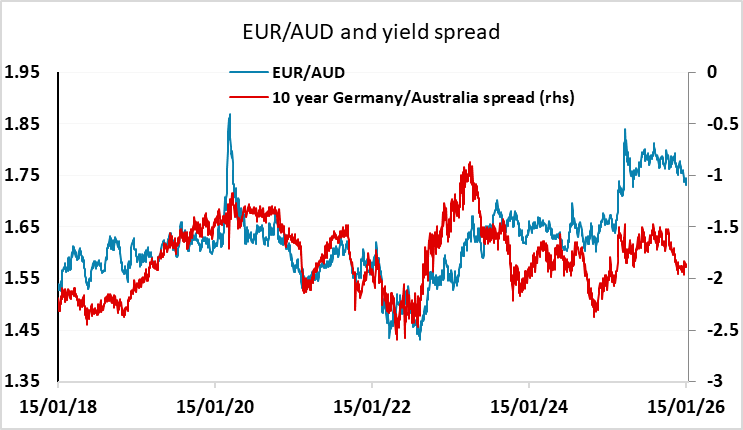 The data that looks potentially most interesting this week is the UK labour market and CPI data. Stronger than expected November GDP data from the UK last week failed to extend GBP’s recent gains against the EUR, suggesting that the pound might now be vulnerable if there is further evidence of weakening in wage and price growth. The labour market data has certainly show a significant decline in both employment and wage growth of late. GBP is already trading above levels consistent with real yield spreads against the EUR, so any increase in rate cut expectations as a result of the UK data ma be enough to propel EUR/GBP back above 0.87.