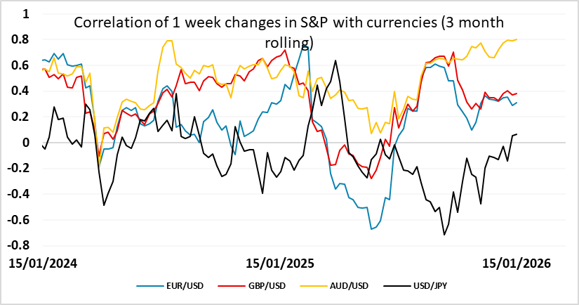 It isn’t clear what impact a correction in equities would have on the USD or the FX market in general. Usually, equity weakness is favourable for the JPY, CHF and USD and undermines the commodity currencies and GBP. Correlations show that this is still broadly the case. But the strength of equities has been US focused, so in this case it is less clear that the USD would benefit from any drop. Probably the clearest implication would be gains for the JPY on the crosses. The JPY has typically benefited on the crosses in recent years from any rise in risk premia, and while this relationship faded through last year, there has still been a tendency for the JPY to weaken with any rise in equity indices. Last week saw some evidence that the strong uptrend in EUR/JPY is under threat, with JPY bears reluctant to push their luck against the threat of Japanese (and possibly even US) intervention. So far, the JPY recovery is just a correction, and may well be another false dawn for JPY bulls. But any equity market correction could trigger an acceleration if we break key supports in EUR/JPY near 182.50.