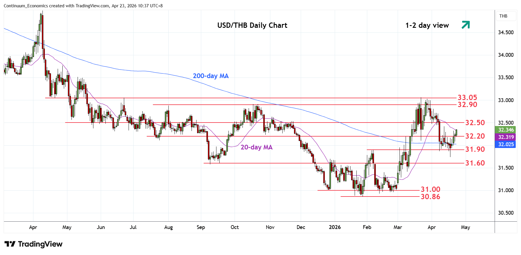 03:00 GMT - Extending bounce from above the 31.70 support as prices retrace losses from the 33.05 March current year high. Break above resistance at the 32.20 congestion see room to strong resistance at the 32.40/50 congestion which is expected to cap. Corrective bounce expected to give way renewed selling pressure later to retest the 31.90 support. Below this will further retrace the January/March rally and see room to 31.70, 61.8% Fibonacci retracement. Lower still, will see extension to strong support at the 31.60/31.58, congestion and 2025 year low.
