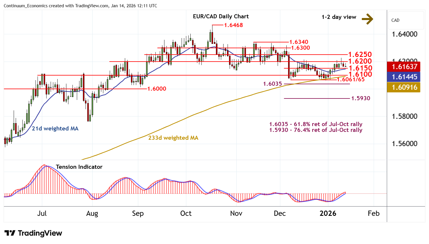 11:55 GMT - Little change, as prices extend cautious/choppy trade within the 1.6150 - 1.6200 range. Intraday studies are under pressure and overbought daily stochastics are unwinding, highlighting room for a test below congestion support at 1.6150. But the positive daily Tension Indicator and improving weekly charts should limit scope in renewed buying interest/consolidation above further congestion around 1.6100. Meanwhile, a close above congestion resistance at 1.6200 would help to improve sentiment and open up a test of 1.6250.