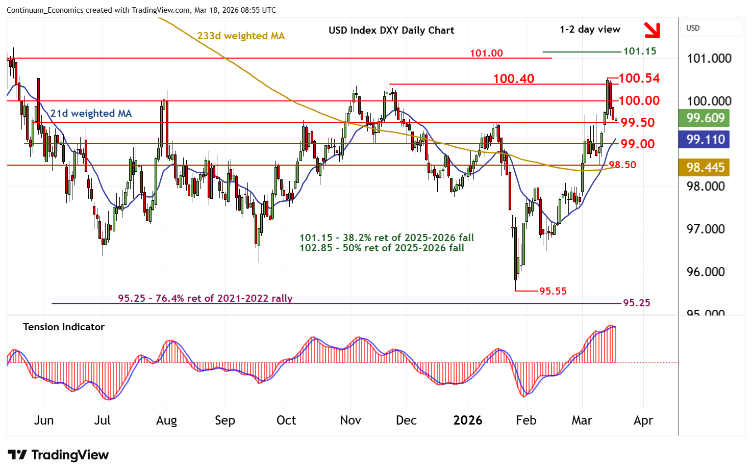 08:45 GMT - Anticipated selling interest has led to a drift lower to congestion support at 99.50, where flat oversold intraday studies are prompting consolidation. Daily stochastics are falling and the daily positive daily Tension Indicator is turning down, highlighting room for further losses in the coming sessions. A break below 99.50 will open up further congestion around 99.00. But rising weekly charts and improving longer-term readings should limit any initial tests in renewed buying interest/consolidation. Following cautious/corrective trade, fresh gains are looked for. A close above congestion resistance at 100.00 will help to stabilise price action. But a further close above above 100.40/54 is needed to turn sentiment positive and confirm continuation of late-January gains, initially towards resistance at congestion around 101.00 and the 101.15 multi-month Fibonacci retracement.