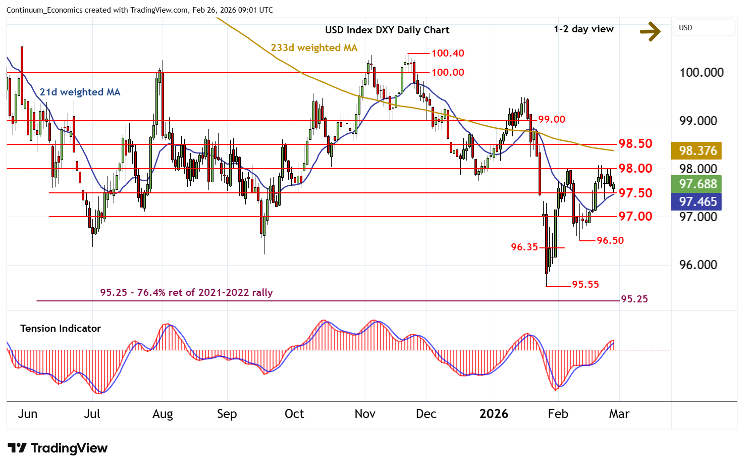 08:55 GMT - The anticipated test of congestion support at 97.50 is giving way to consolidation, as oversold intraday studies flatten, with prices currently trading around 97.65. Overbought daily stochastics are under pressure and the rising daily Tension Indicator is flattening, suggesting room for further losses in the coming sessions. A break below 97.50 will add weight to sentiment and open up further congestion around 97.00. But rising weekly charts should limit any initial tests in consolidation. Meanwhile, resistance remains at congestion around 98.00 and should cap any immediate tests higher. A break above here, however, will open up a test of further congestion around 98.50, where renewed selling interest is expected to appear.