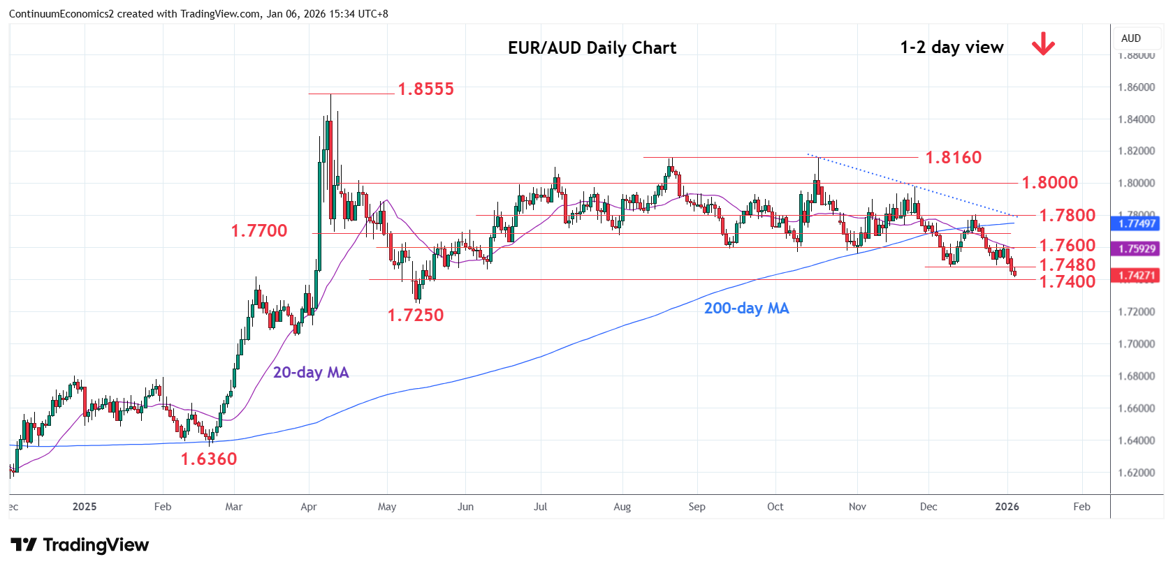 07:45 GMT - Break of the 1.7480 December low see prices extend losses from the 1.8160, August/October highs. Negative daily studies keeps pressure firmly on the downside and see room to target support at the 1.7400 congestion. Break of the latter will see room to the 1.7260/50, 50% Fibonacci level and May low. Meanwhile, resistance is lowered to the December low at 1.7480 which is expected to cap. Only above here will see room for stronger corrective bounce to strong resistance at the 1.7570/1.7600, October/November lows and congestion area.