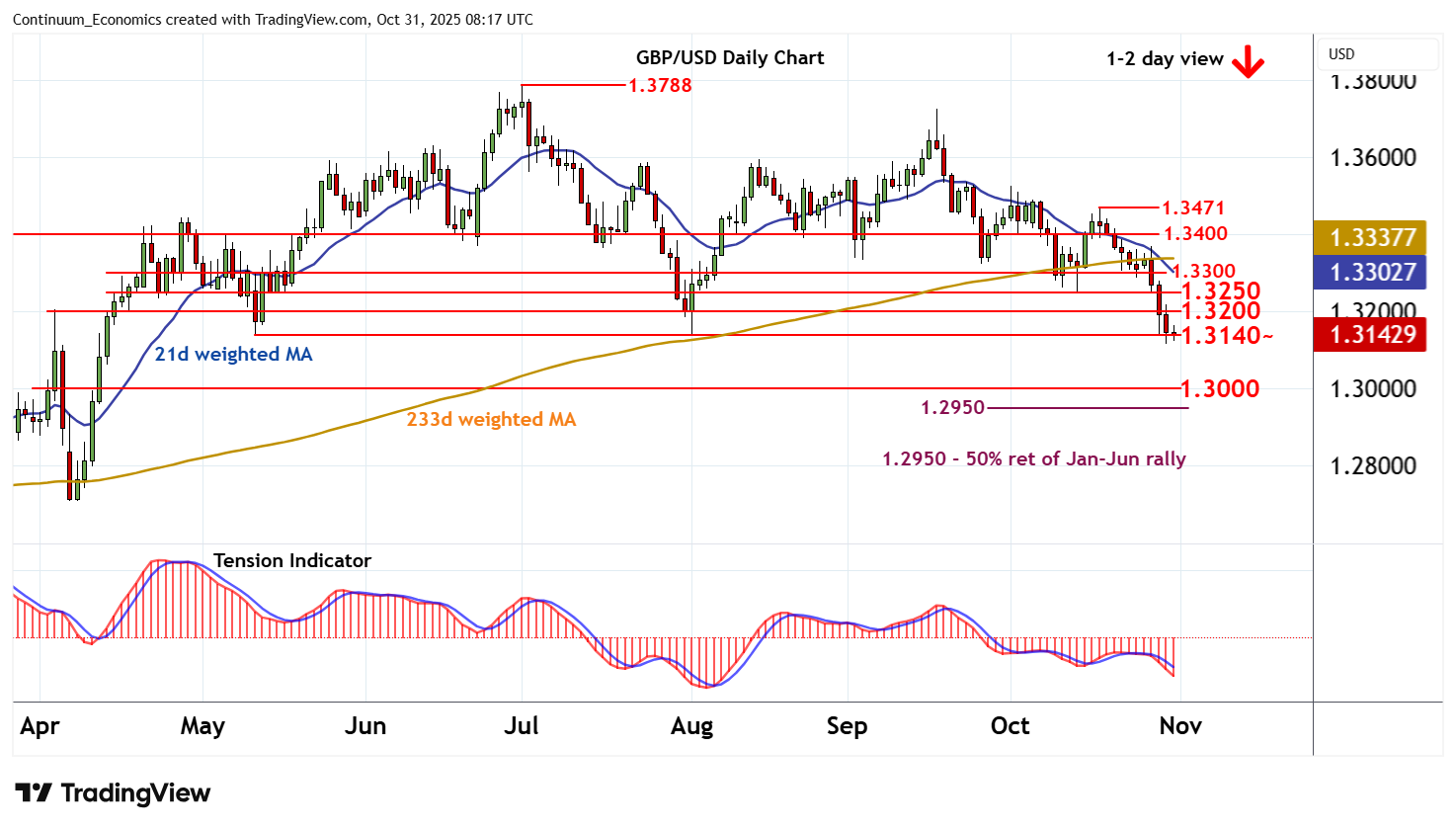 08:10 GMT - Little change, as mixed intraday studies keep near-term sentiment cautious and extend pressure on critical support at the 1.3140~ May-August range lows. Daily readings continue to track lower and broader weekly charts are also under pressure, highlighting room for further losses in the coming sessions. A close beneath here would add weight to sentiment and confirm a deeper correction of the January-June rally, initially targeting congestion around 1.3000. Meanwhile, resistance remains at congestion around 1.3200. A close above here would help to stabilise price action and prompt consolidation beneath further congestion around 1.3250.