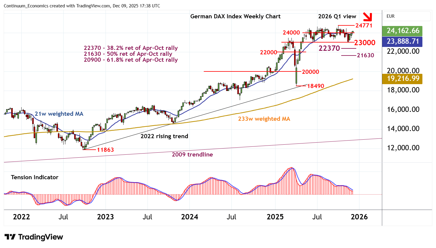 In the coming weeks, cautious trade is expected to give way to fresh losses, with focus to turn back to congestion around 23000. A break beneath here will complete a multi-month distribution top and extend October losses towards the 22370 Fibonacci retracement.