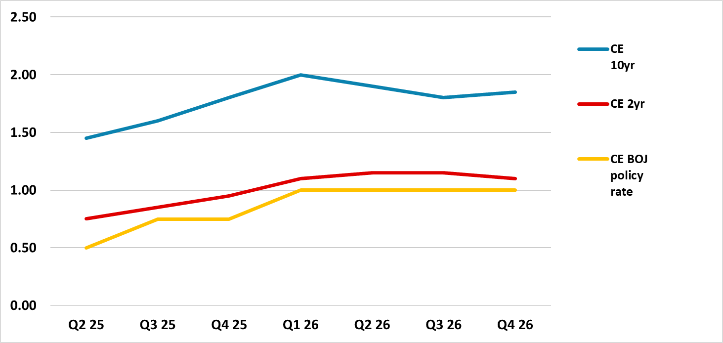 Expectations of BOJ policy normalization remain key for 2yr JGB’s. The expectations are that this will be at a slow pace, with the next 25bps hike not fully discounted until Q1 2026. The tariffs and trade threats have tempered BOJ action for now. However, inflation remains consistent with the case for BOJ normalization to deliver a further 25bps hike in 2025 and we see the prospect of an earlier than expected hike in September/October 2025 after a trade deal is done with the U.S. We see 2yr yields at 0.95% end 2025 (Figure 3). For 2026, we see consumer spending being soft, which dampens inflation and causes a CPI move back just below 2%. This can slow the BOJ normalization pace versus 2025 and we see only one 25bps BOJ hike in 2026. This can still push up 2yr yields further.