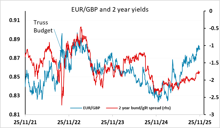 As it stands, the market is pricing a December rate cut from the BoE as an 87% chance, and it’s hard to see how a cut will be avoided if the Budget enacts the expected fiscal tightening, unless that tightening is delayed until the end of the parliament. Such a policy would be an unusually politically short-sighted approach, as end of parliament fiscal tightenings are not usually conducive to re-election. So the Budget is likely to be tight enough to persuade at least one of the five MPC members who voted for no change in rates in November to vote for a cut in December. But given the high probability already attached to a cut, any negative impact on GBP should be modest. More dangerous for the pound would be a Budget that is seen as failing to properly address UK fiscal problems. That sort of Budget led to the simultaneous sharp decline in GBP and sharp rise in UK yields in 2022. An outright failure on these grounds seems unlikely, but the Budget could be seen to be a rather patchwork attempt, with a lot of politically motivated concessions, so we would not expect a particularly positive response. Even so, we doubt any negative impact will be sufficient to propel EUR/GBP back above the recent highs of the year at 0.8865.