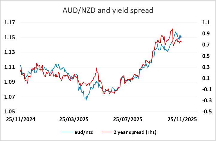 Before the UK budget there is the RBNZ rate decision and Australian October CPI data. A 25bp rate cut is more than fully priced in for the RBNZ, with a minor risk seen of a 50bp cut. A 25bp cut is unlikely to have much impact, given the pricing, with any FX move likely to depend on any signal from the RBNZ about future rate cut prospects. As it stands, the market is priced for a total of 40bps of cuts (including today’s) by mid-2026, so any strong indication that further cuts are likely could be expected to weaken the NZD modestly. A bigger positive impact might be seen if the RBNZ were to suggest that they have finished the easing cycle, although this looks low probability. A 25bp cut with little change to forward guidance would suggest a modest NZD rise, but AUD/NZD would likely hold close to 1.15.
