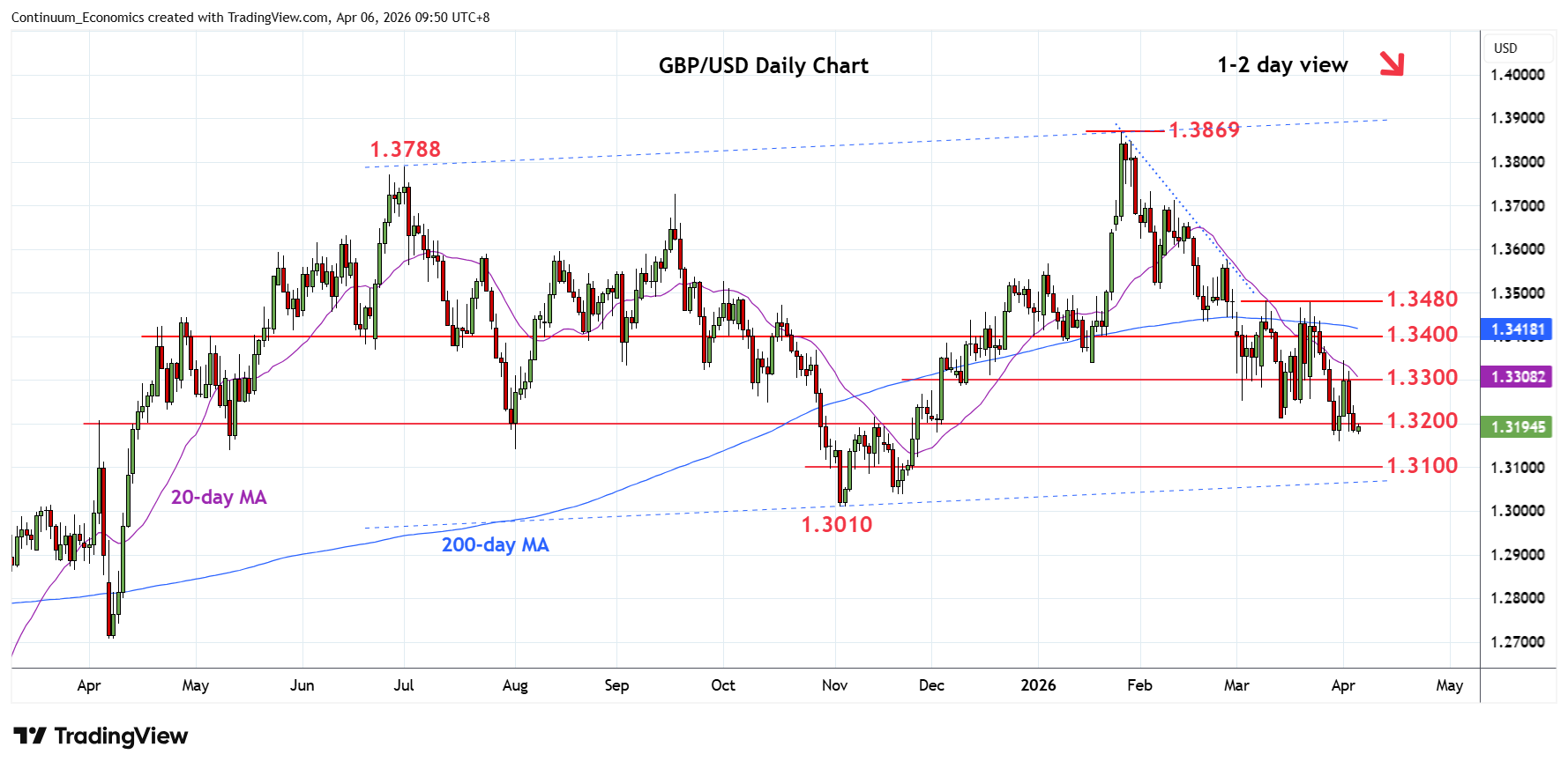Under pressure as break of the 1.3200 level expose the 1.3160 low of last week to retest
