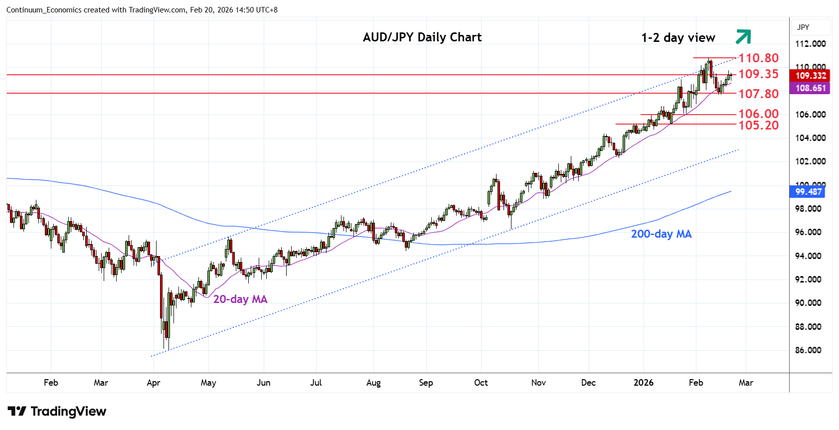 06:50 GMT - Bounce from support at the 108.00/107.80 congestion area has seen gains to approach the 110.00 level. Above this will see scope for retest of the 9 February current year high at 110.80 where reaction can be expected. Clearance, if seen, will extend the broader gains from the 2020 year low and see room to the 112.00/113.00 congestion area. Meanwhile, support at the 108.00/107.80 support should underpin. Would take break here to fade the upside pressure and open up room for deeper pullback retrace strong gains from the 86.00, April 2025 year low.