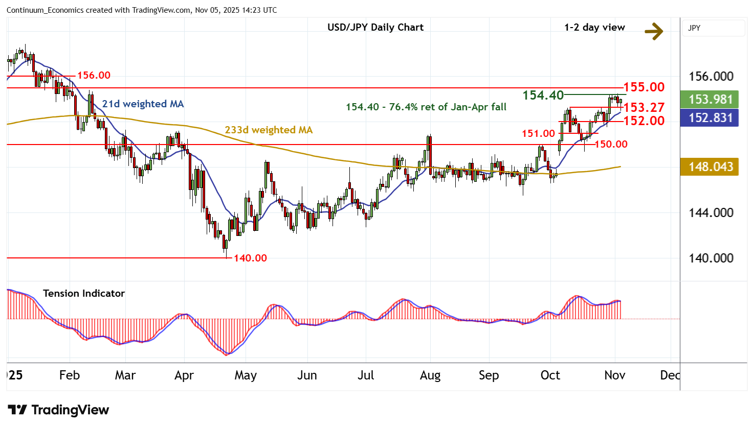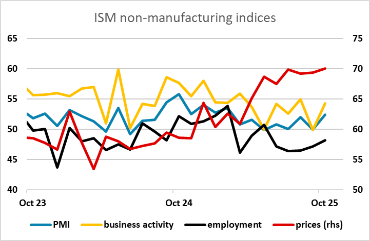 A much stronger than expected ISM services survey is giving the USD and riskier currencies a boost, with US yields up around 5bps along the curve in response. The biggest impact has been on USD/JPY, which is threatening the recent high at 154.40, while EUR/USD has only edged a little lower to test the lows of the day (and the last three months) at 1.1470. The impact on currencies is coming more from the general positive response from equities than the movement in yield spreads, which have had a diminishing impact in recent months. Commodity currencies gained ground as equities rallied at the cash open in the US, and have broadly held their own against the USD in response to the data. The JPY is consequently under general pressure on the crosses, and EUR/JPY will be targeting retracement levels after the recent decline, with 1.7725/50 looking like the resistance area. A USD/JPY break of 154.40 would bring the possibility of BoJ intervention back into focus after recent comments from Finance minister Katayama calling the recent JPY weakness one-sided and rapid, although this would be unlikely today.