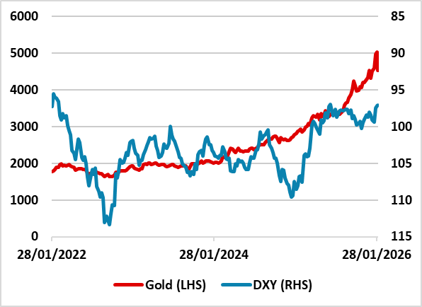• For now we see some further profit-taking on risky positions in gold/silver/copper/equities and short USD positions. However, a bigger macro catalyst is required to produce a deep correction in equities and major risk off. The nomination of Kevin Warsh for Fed chair is unlikely to be the catalyst, as his previous hawkishness is not representative and a major change in Fed decisions remains unlikely. The U.S. economy/AI revenue growth and Trump erratic decision making are all catalysts for a deeper correction, but none at the moment is producing the news flow to immediate turn a pullback into say a 5-10% U.S. equity market correction. Iran/reciprocal tariffs and U.S. labor market will be watched in the coming weeks.