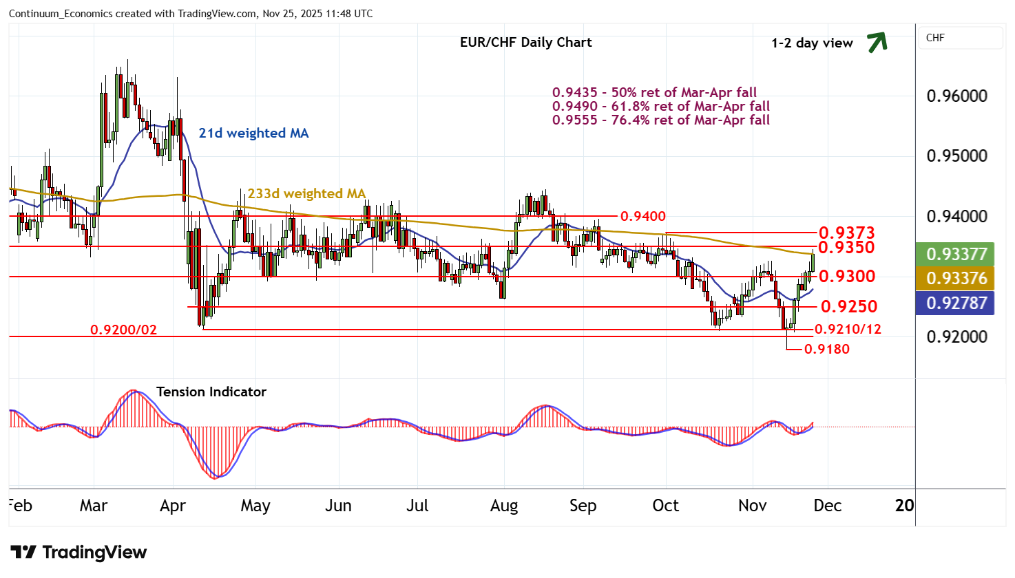 11:20 GMT - Cautious trade has given way to anticipated gains, as intraday studies tick higher, with focus turning to congestion resistance at 0.9350. Daily readings are also positive, highlighting room for a test above here. But overbought daily stochastics could limit initial scope in consolidation beneath the 0.9373 monthly high of 1 October, before improving weekly charts prompt further strength. Meanwhile, support remains at congestion around 0.9300 and should underpin any immediate setbacks.