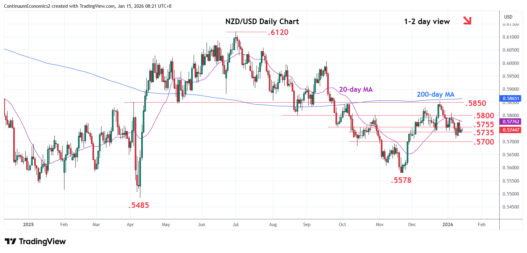 00:25 GMT - Little change, as prices extend consolidation above the .5711 low of last week. The resulting flag pattern and negative daily studies suggest scope for break of strong support at the .5715/00 area to open up room for deeper pullback to retrace the November/December rally. Lower will see room to the .5685/.5650, 61.8% Fibonacci level and congestion area. Meanwhile resistance at the .5755/.5800 area is expected to cap. Would take break here to revive upside focus for retest of .5850 high and extend the broader gains from .5578 November low.