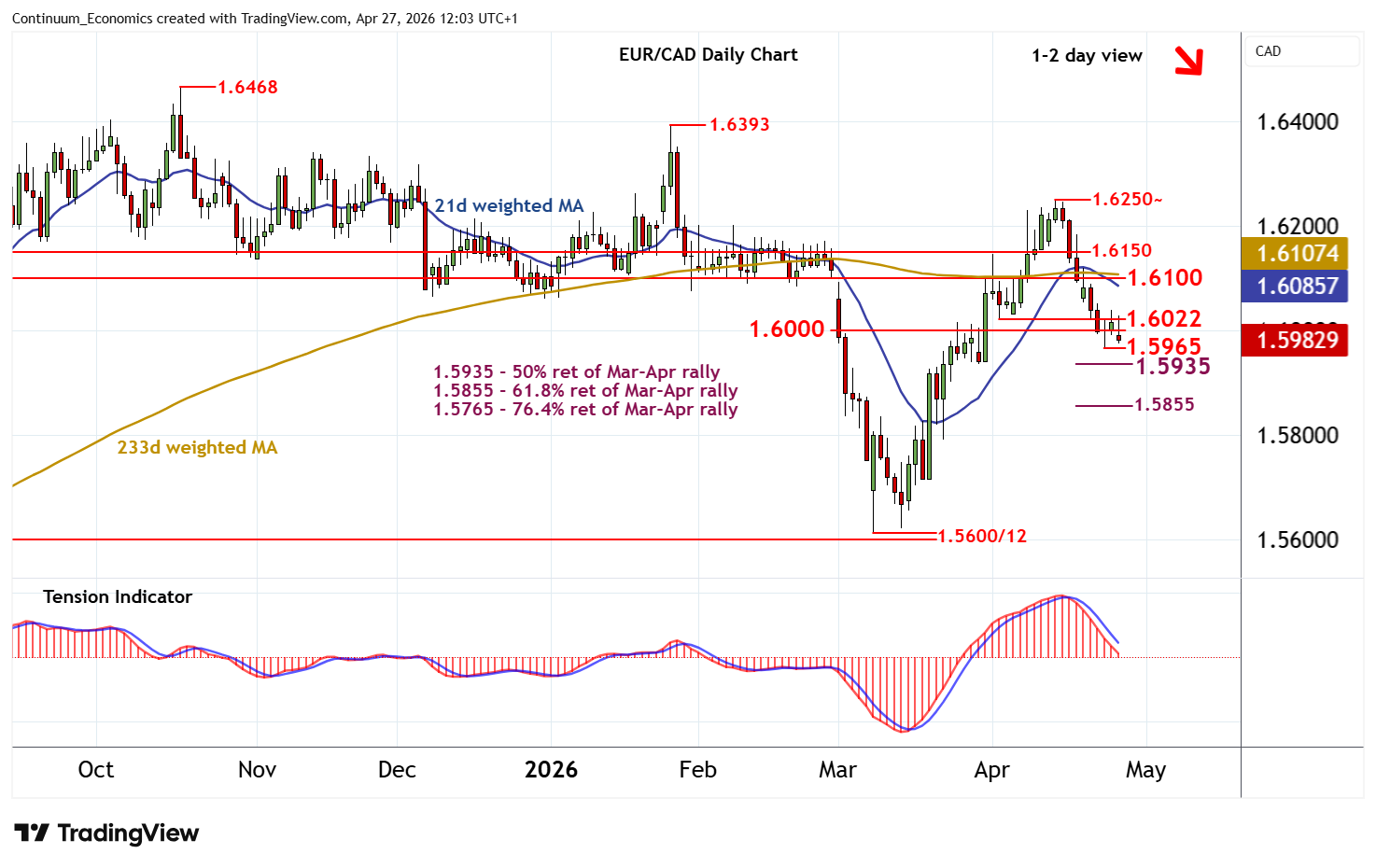 11:50 BST - Choppy trade around 1.6000 has given way to the anticipated break, with prices currently balanced in cautious trade around 1.5985. Daily readings are under pressure and overbought weekly stochastics are unwinding, highlighting room for further losses in the coming sessions. However, a break below the 1.5965 weekly low of 23 April is needed to turn sentiment negative and extend mid-April losses initially to the 1.5935 Fibonacci retracement. Further selling pressure would open up the 1.5855 retracement. Meanwhile, resistance is at 1.6000 and extends to the 1.6022 lows from 2-6 April. A close above here would help to stabilise price action and prompt consolidation beneath 1.6100.