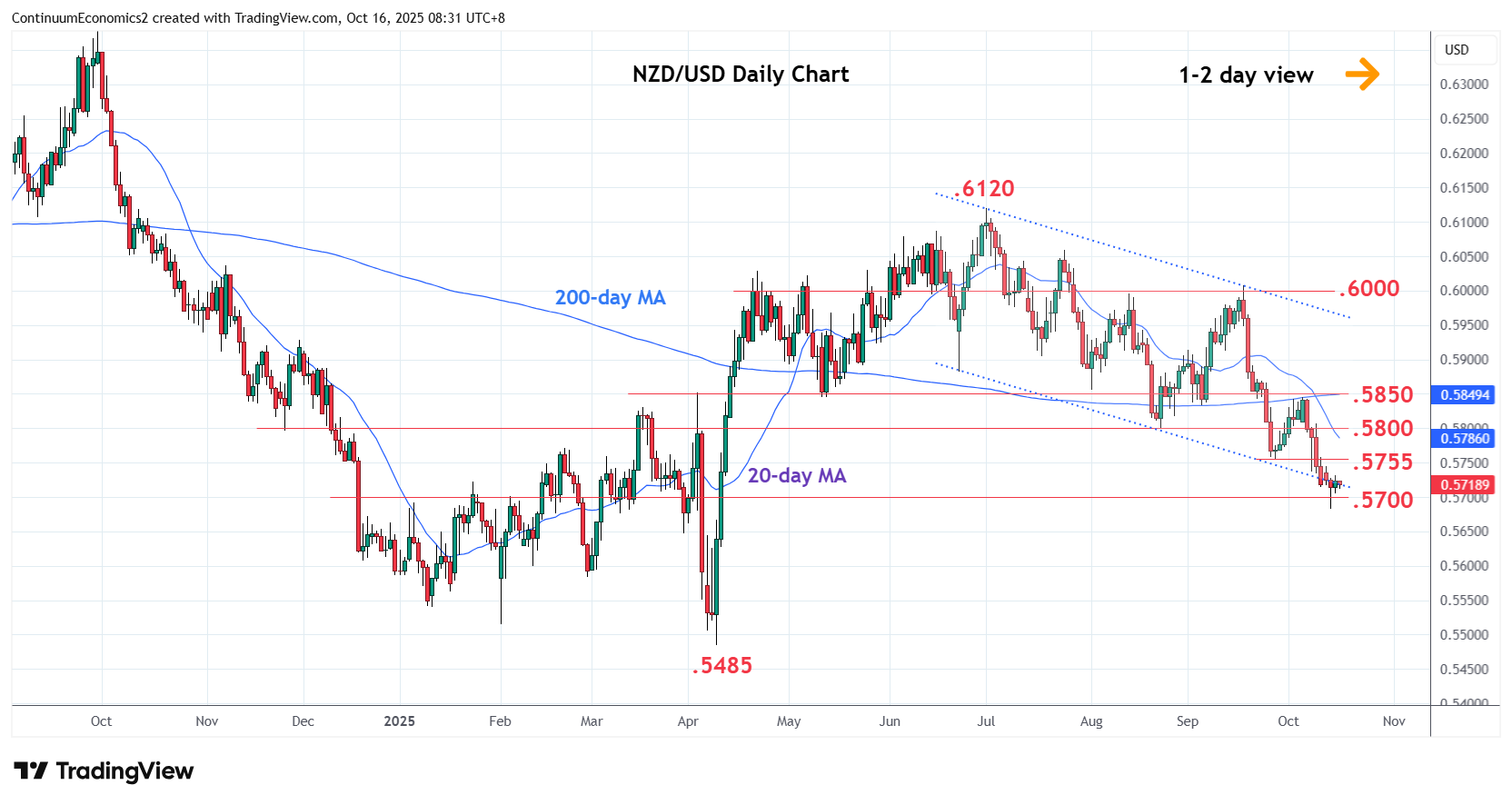 00:30 GMT - Saw bounce from Tuesday low at .5683 low to regain the .5700 level as prices consolidate losses from the .5845, high of 6 October. Intraday and daily studies have turned up to unwind oversold readings and see room to resistance at the .5755, September low. Break here, if seen, will open up room for stronger bounce to retest the August low at .5800 which is expected to cap. Correction is expected to give way to renewed selling pressure later. Below the .5700 level and .5683 low will see room for extension to support at the .5650/.5635 congestion and 76.4% Fibonacci level.