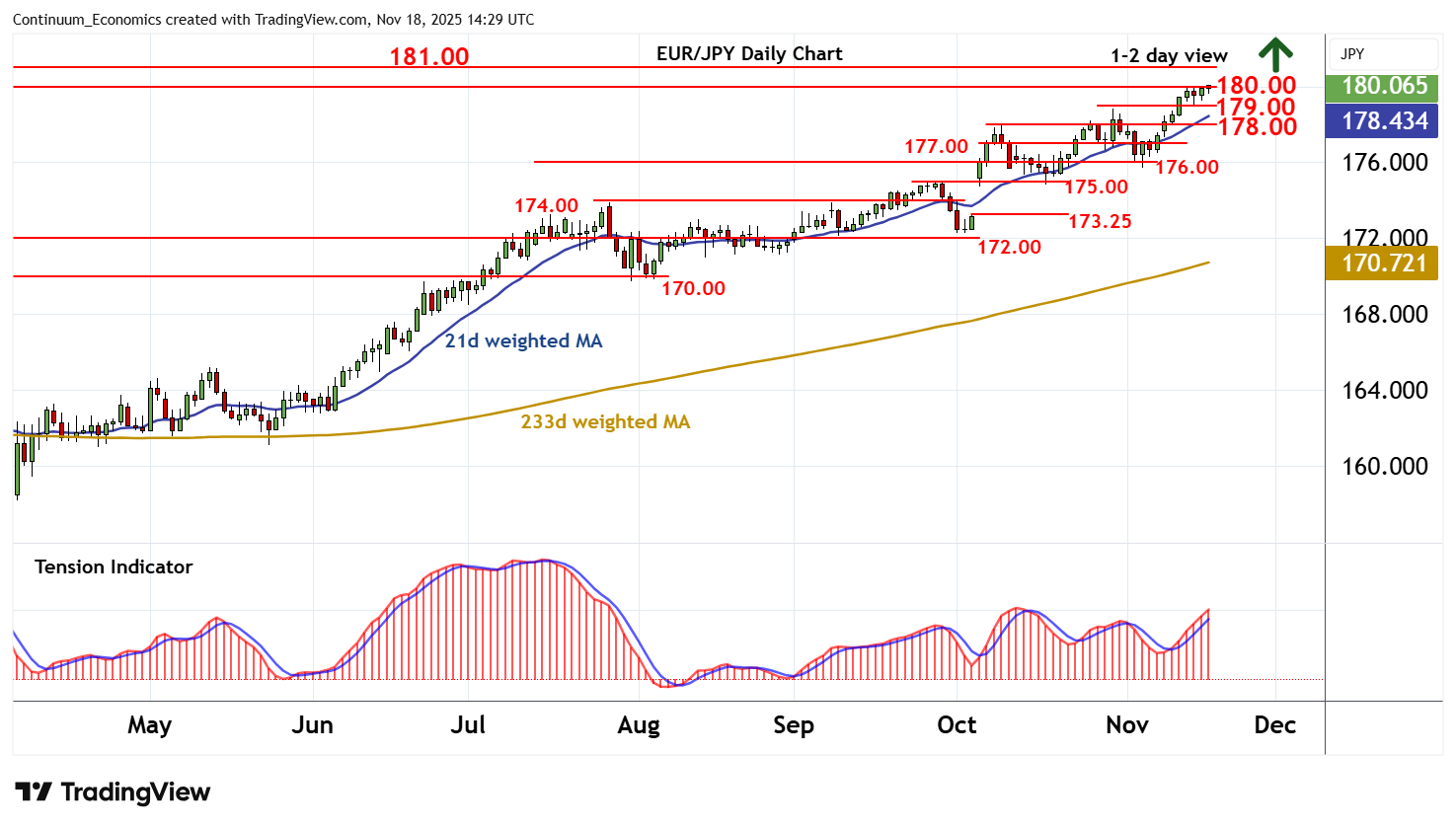 14:25 GMT - Still little change, as prices extend pressure on resistance at 180.00. Intraday studies are rising and daily readings are positive, highlighting room for further gains in the coming sessions. A close above here will improve sentiment and post multi-year highs as focus turns to 181.00. Meanwhile, support remains at the 179.00 break level. A close beneath here will turn sentiment neutral and prompt consolidation above 178.00.