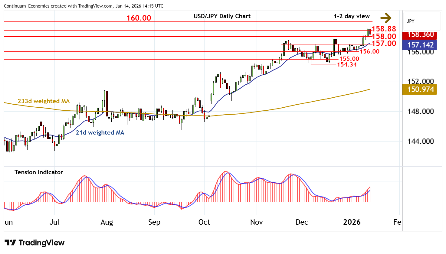 14:05 GMT - The break above the 158.88 year high of 10 January 2025 has been pushed back sharply from 159.45, as overbought intraday studies unwind, with prices currently trading around 158.25. Overbought daily stochastics are ticking lower, suggesting room for a test below support at 158.00. But the positive daily Tension Indicator and improving weekly charts are expected to limit scope in renewed buying interest/consolidation towards 157.00. Meanwhile, a close back above 158.88 would improve sentiment and extend April 2025 gains initially towards congestion around 160.00.