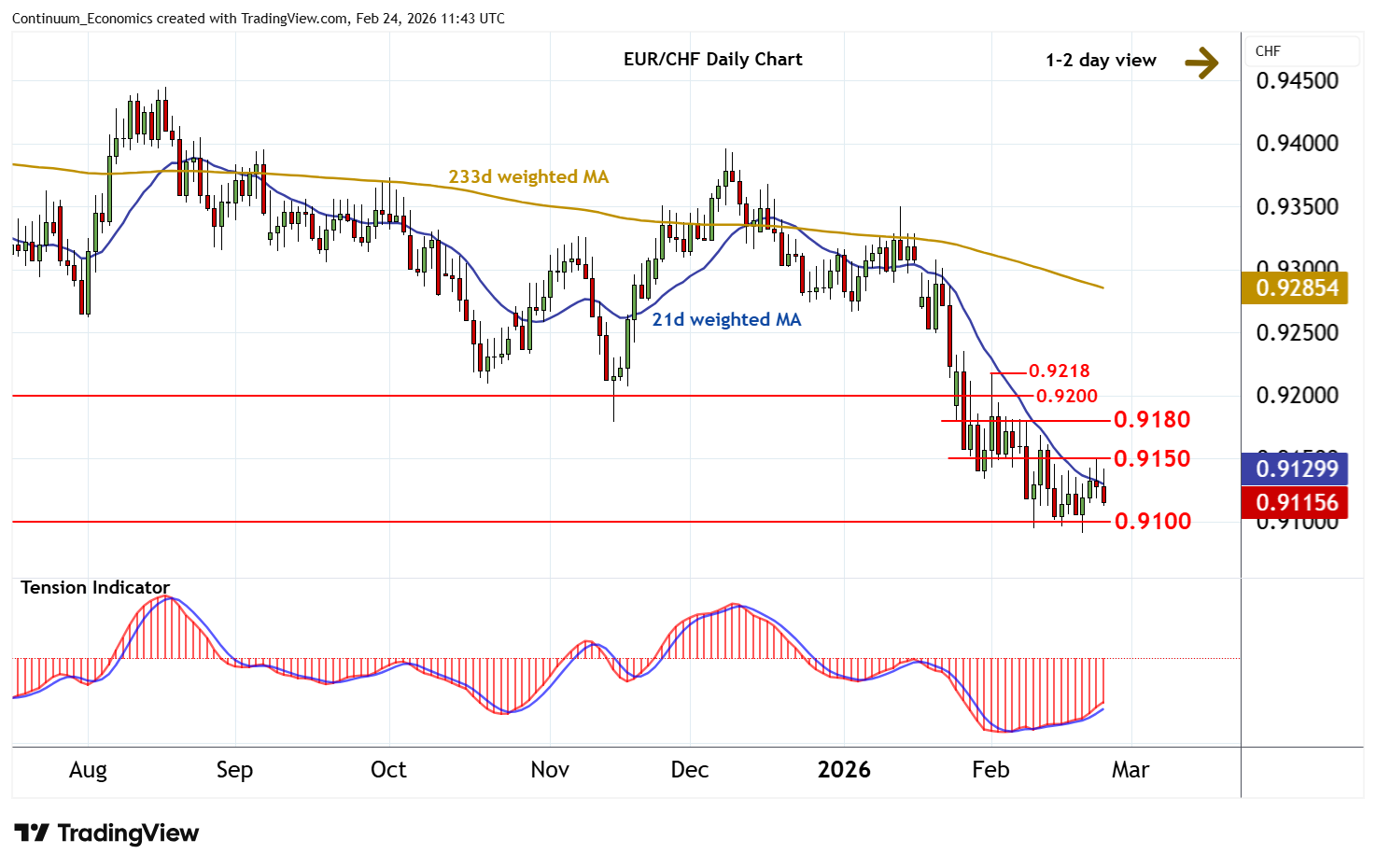 11:05 GMT - Cautious trade is giving way to a minor pullback, as intraday studies turn down and overbought daily stochastics flatten. Focus is on critical support at the 0.9090 current year low of 19 February and congestion around 0.9100. Rising daily stochastics and flat oversold weekly stochastics are expected to limit any initial tests in consolidation, before the negative weekly Tension Indicator and bearish longer-term readings prompt a break. A close beneath here will turn sentiment negative and extend long-term bear trends towards psychological support at 0.9000. Meanwhile, resistance remains at 0.9150 and should cap any immediate tests higher.