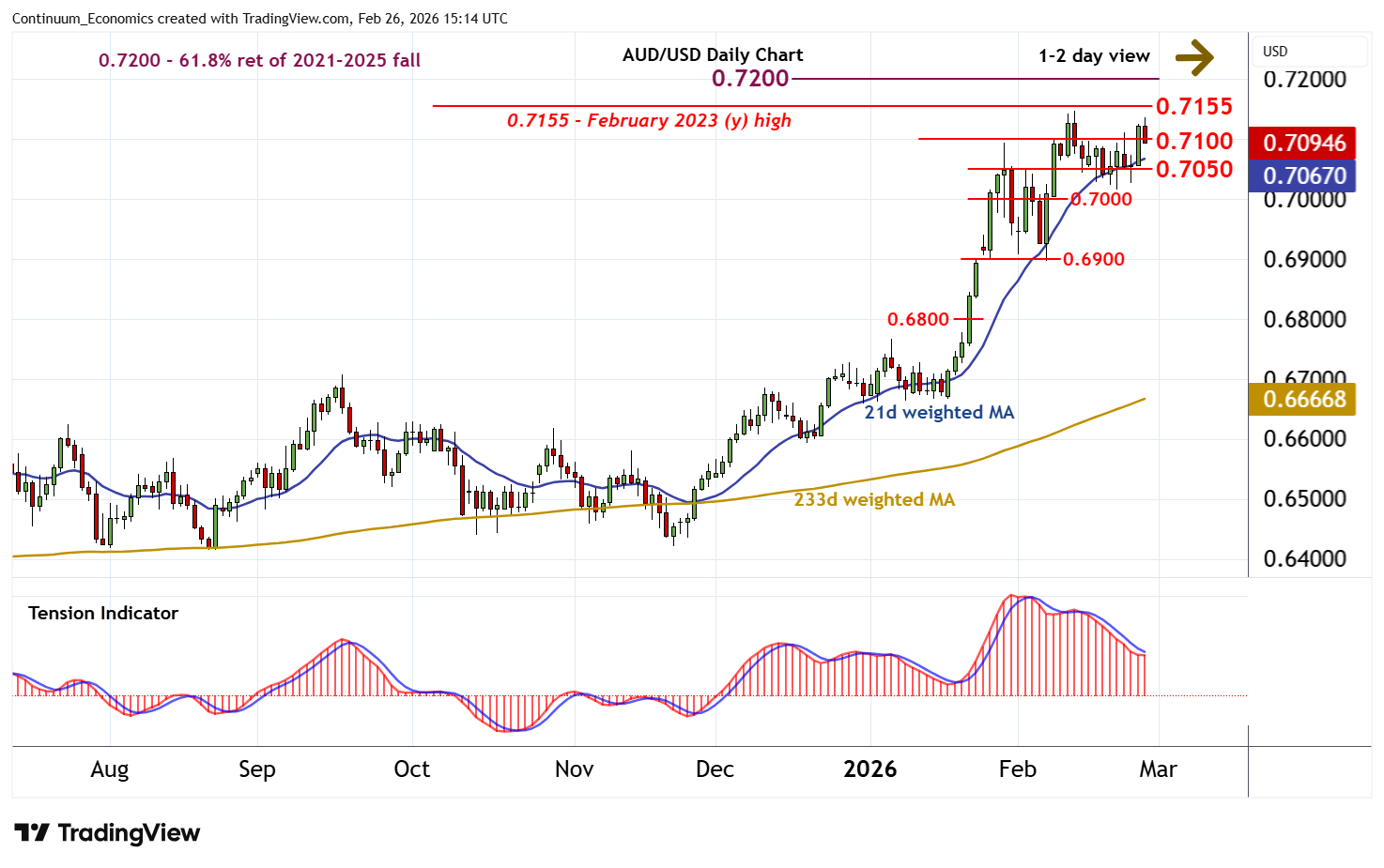 Anticipated minor tests higher have been pushed back from beneath strong resistance at the 0.7145 current year high of 12 February and the 0.7155~ year high of February 2023