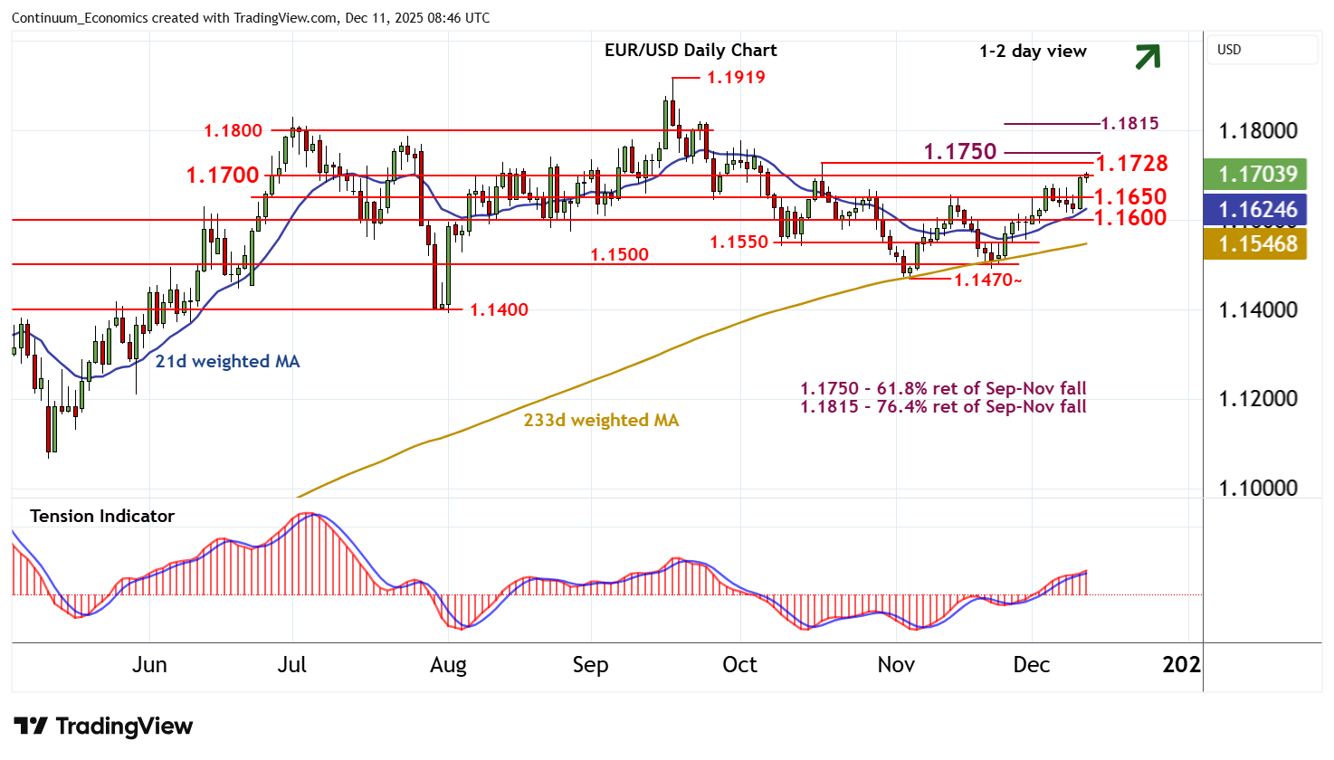 08:30 GMT - Anticipated gains have reached congestion resistance at 1.1700, where overbought intraday studies are prompting short-term reactions. Daily readings have ticked higher and broader weekly charts are rising, highlighting room for continuation towards the 1.1728 weekly high of 17 October, ahead of the 1.1750 Fibonacci retracement. Meanwhile, support is raised to congestion around 1.1650. A close beneath here, if seen, will help to stabilise price action and prompt consolidation above further congestion around 1.1600.