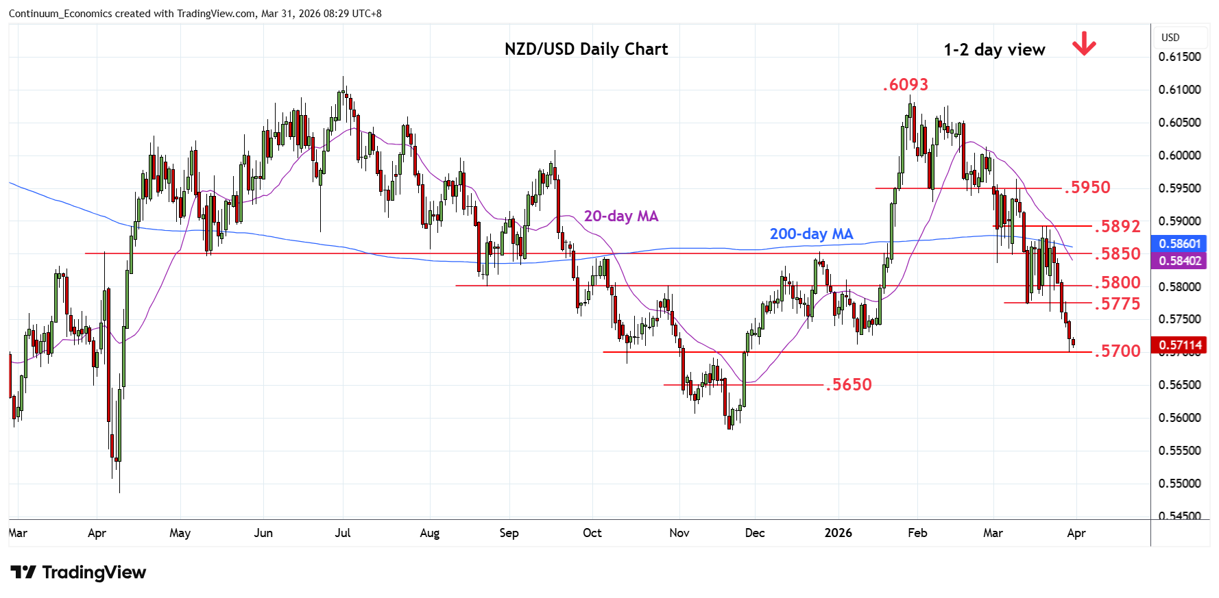 | R4 | .5892 | ** | 19 Mar high | S1 | .5700 | * | 30 Mar YTD low, 76.4% | |