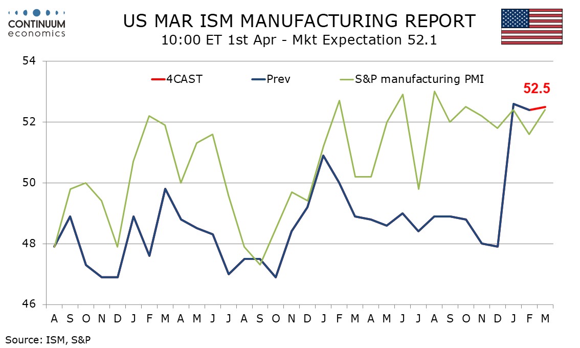We expect March’s ISM manufacturing index to maintain the significantly improved tone of January and February data, edging marginally higher to 52.5 from 52.4. This would be a third straight positive to follow ten straight negatives.