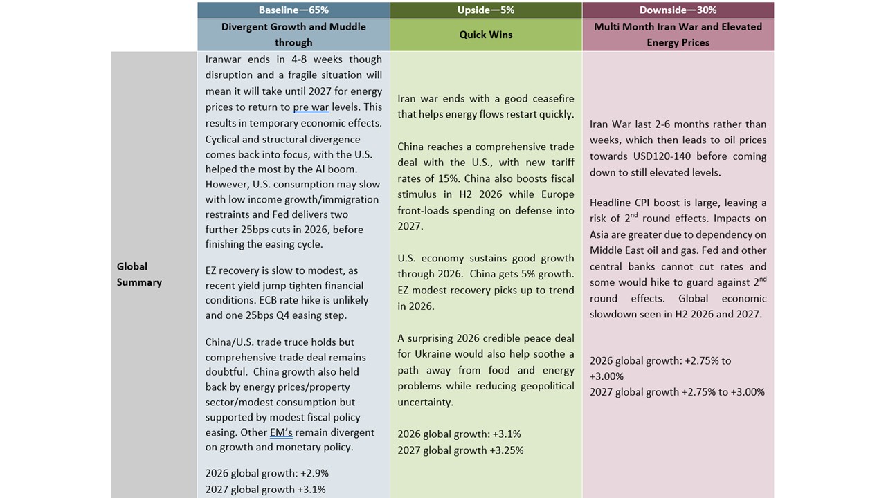· Risks to our views: A 2-to-6 months Iran war can spike WTI to USD 120-180 (depends on duration and further damage) and remain elevated for the remainder of 2026. This would prompt a stagflation hit to the global economy; cancel interest rate cuts and in some cases prompt modest rate hikes to lean against 2nd round effects. Would likely stop the Fed from easing further initially. However, if the shock caused a U.S. recession, then the Fed would cut policy rates to 2% or lower, which would see 2yr yields drop but sharp yield curve steepening and a U.S. equity bear market. Fiscal policy would provide less of a buffer due to limited fiscal space in most major countries, except balance sheet strong DM countries.