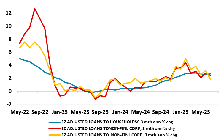 First, Tuesday’s (Oct 28) updated bank lending survey (BLS) will play an important role in shaping ECB thinking this month, not least as it suggested in the last two assessments that for firms with perceived risks related to the economic outlook continued to contribute to a tightening of credit standards. Indeed, July’s BLS made it clear that the tariff threat was taking a toll on banks’ willingness to lend and firm’s appetite to borrow even in March, ie well before the possible scale and breadth of the tariff threat emerged. Indeed, it does seem as if what credit growth there is is increasingly concentrated among larger and less risky firms. Indeed, results from the ECB survey on the access to finance of enterprises (SAFE) confirm that small firms have experienced a more muted decline in external financing costs than larger producers. Moreover, as the September Council meeting noted, banks have been de-risking by skewing their corporate lending away from risky firms towards safer ones. Thus, the decline in the observed cost of borrowing for firms could therefore partly reflect a compositional effect, which might mask true (and somewhat higher) borrowing costs – does this imply that the looming new BLS will corroborate that banks have become less willing to lend? If so, the ensuing change in borrower composition and the muted risk appetite of banks point towards the risk-taking and balance sheet channels of monetary policy operating less strongly for lower-income households and smaller firms during the easing cycle. Since these groups typically have higher marginal propensities to consume and invest, this heterogeneity in transmission may reduce the effectiveness of recent interest rate cuts in stimulating aggregate demand in the current context of high global uncertainty, this the view of ECB Chief Economist Lane.