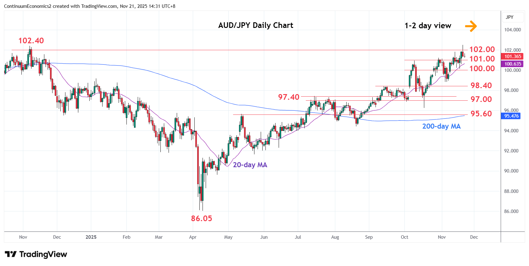 Chart AUD/JPY Update: Settled back from test of 102.40 resistance