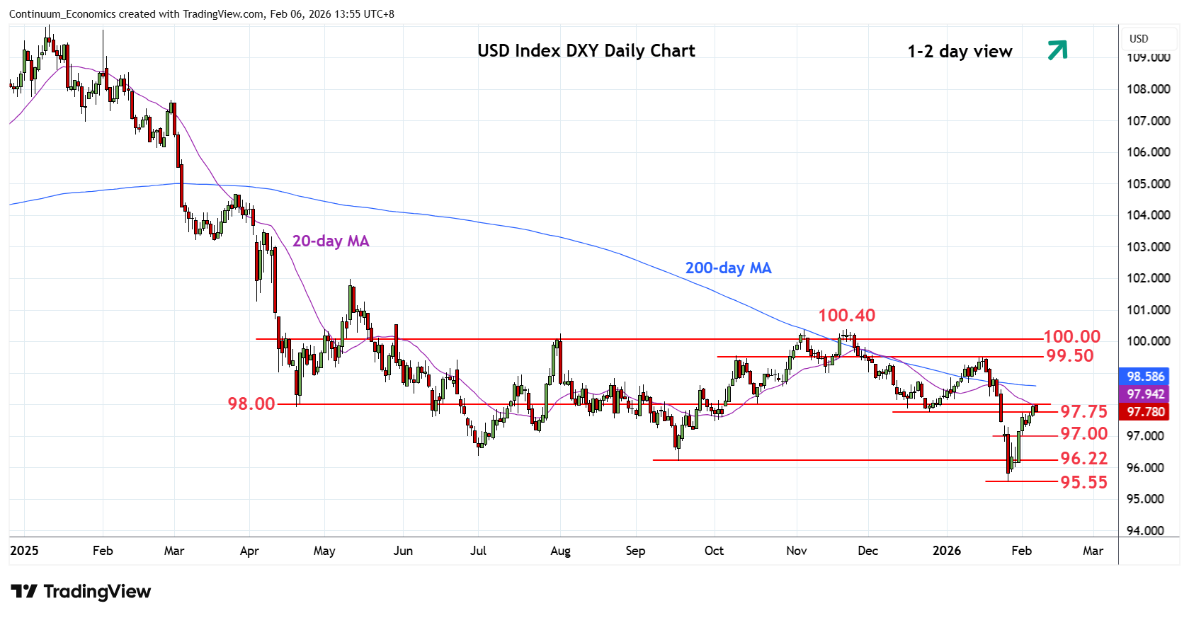 06:50 GMT - Settling back from test of strong resistance at the 97.75/98.00 area and 61.8% Fibonacci level. Daily studies are still tracking higher and break here cannot be ruled out to further retrace the January losses. Higher still, if seen, will see room for extension to the 98.55, 76.4% Fibonacci level. Meanwhile, support at the 97.30/97.00 congestion area now underpin. Would take break here to return focus to the downside for retest of the 96.22 and 95.55, September 2025 year low and January current year low.