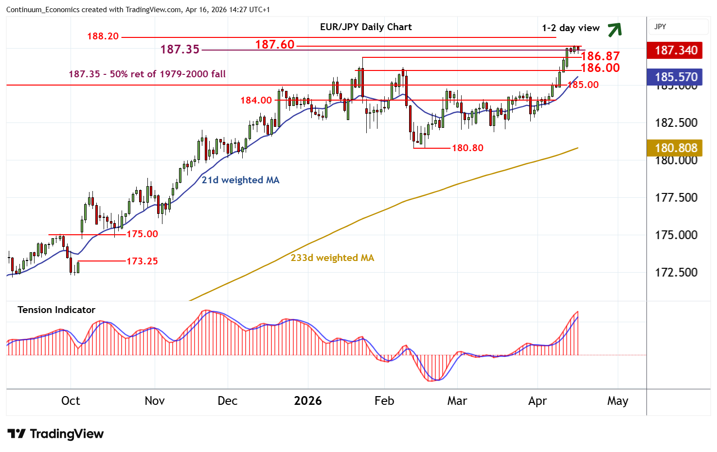 Little change, as prices extend cautious trade at multi-year highs within strong resistance at the 187.35 multi-decade Fibonacci retracement and the 187.60 high of August 1990