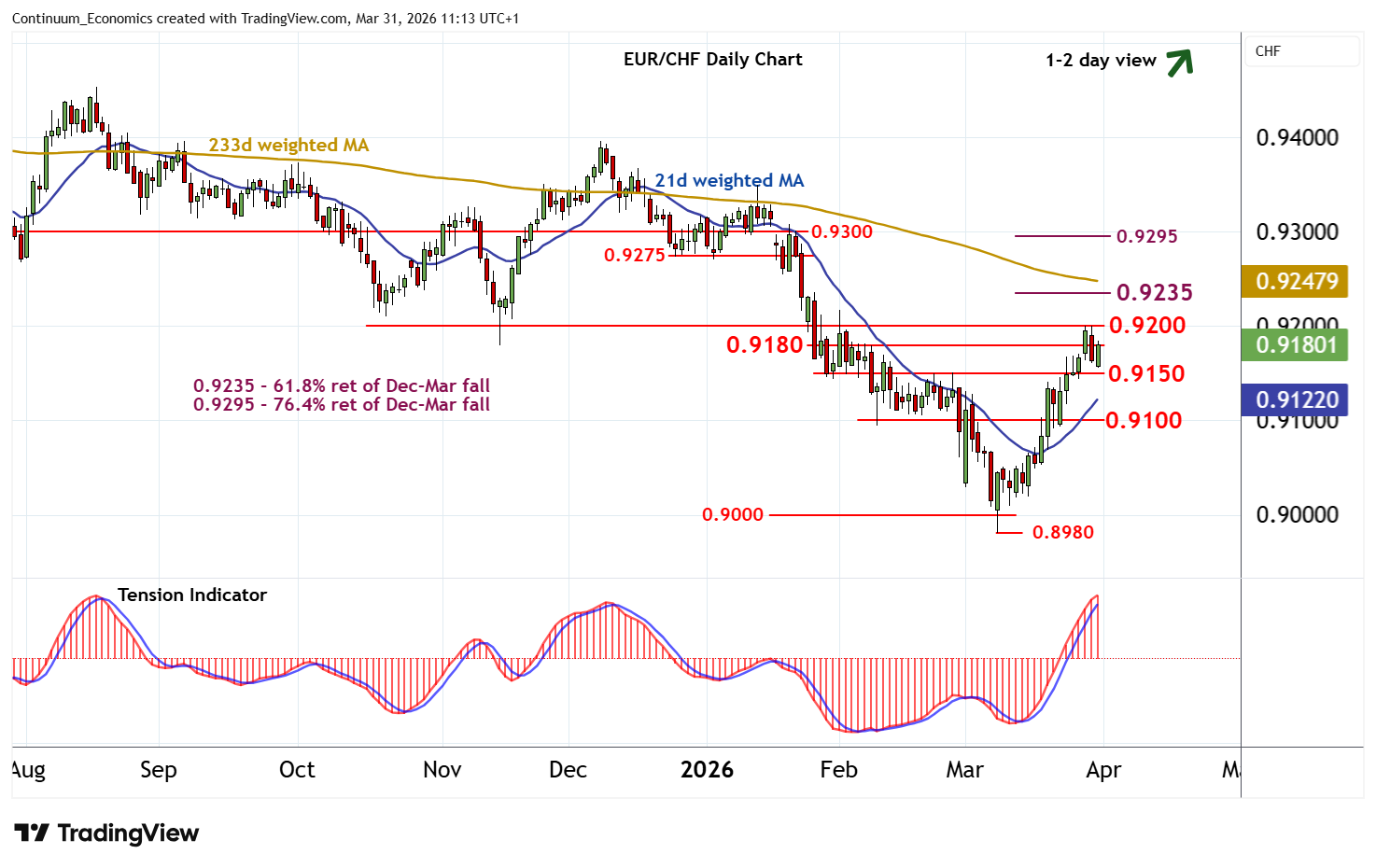 10:50 BST - The pullback from resistance at 0.9200 has reached 0.9155, where unwinding oversold intraday studies are prompting a bounce back to congestion resistance at 0.9180. Beyond here is 0.9200. But a tick lower in overbought daily stochastics is expected to limit any initial tests of this range in consolidation, before the rising daily Tension Indicator and positive weekly charts prompt further gains. A close above 0.9200 will improve sentiment and extend March gains towards the 0.9235 Fibonacci retracement. Negative longer-term charts could prompt more significant profit-taking/consolidation towards here. Meanwhile, a close below support at 0.9150, if seen, will add weight to sentiment and prompt a deeper reaction towards 0.9100.