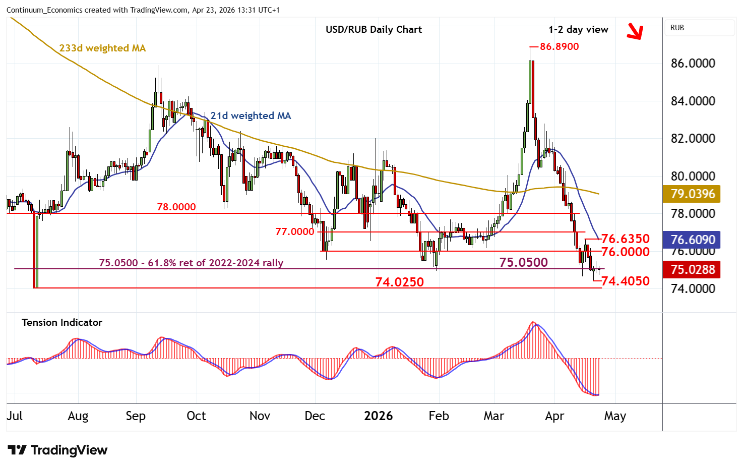 | R3 | 77.0000 | ** | congestion | S2 | 74.4050 | * | 21 Apr YTD low | |