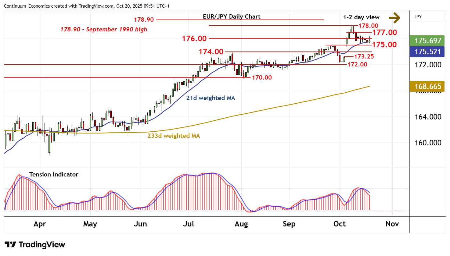 09:45 BST - Cautious trade has given way to a test above resistance at 176.00, with prices meeting selling interest around 176.35 before settling into consolidation around 175.80. Intraday studies are rising, suggesting room for a fresh test above 176.00. But negative daily readings and mixed/negative weekly charts should limit scope in renewed selling interest beneath 177.00. Following cautious trade, fresh losses are looked for. A later break below congestion support at 175.00 will add weight to sentiment and open up further congestion around 174.00. A further break beneath here would open up the 173.25 high of 3 October, and close the gap opened from here.